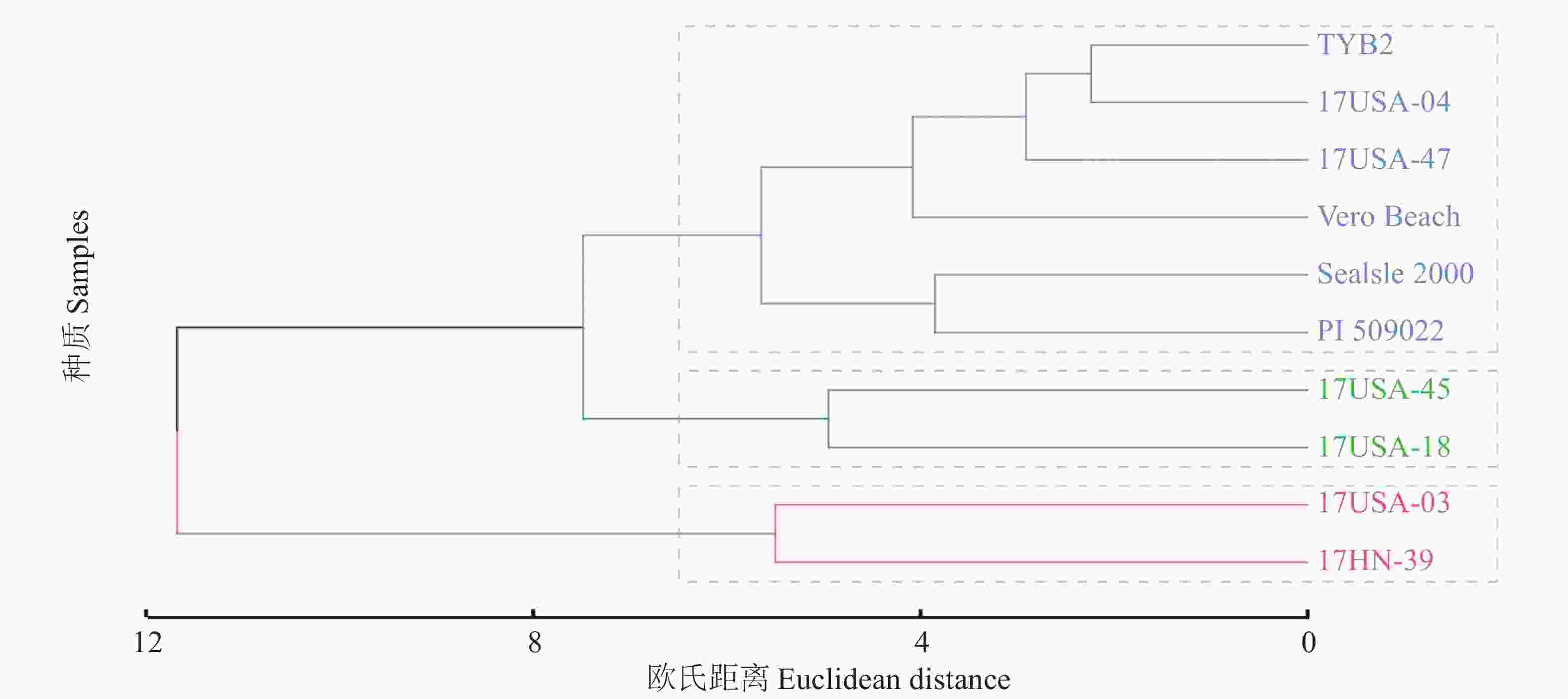 以课题组前期研究筛选的10份种质为试验材料,分别为17USA-18、17USA-45、SeaIsle 2000、TYB 2、Vero Beach、17USA-47、17USA-04、PI
