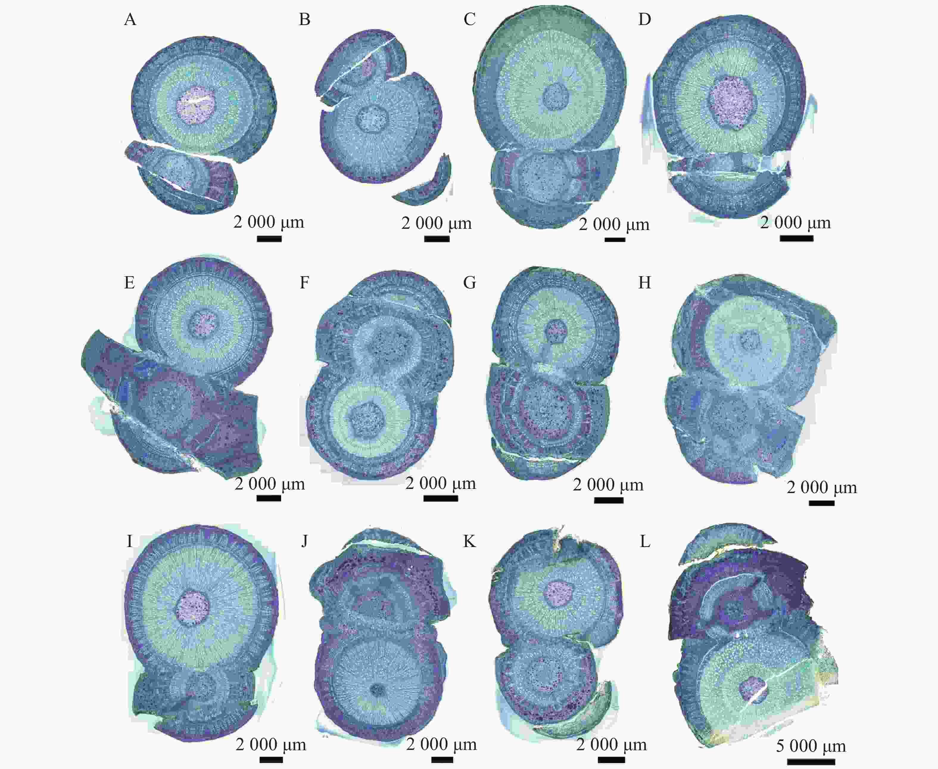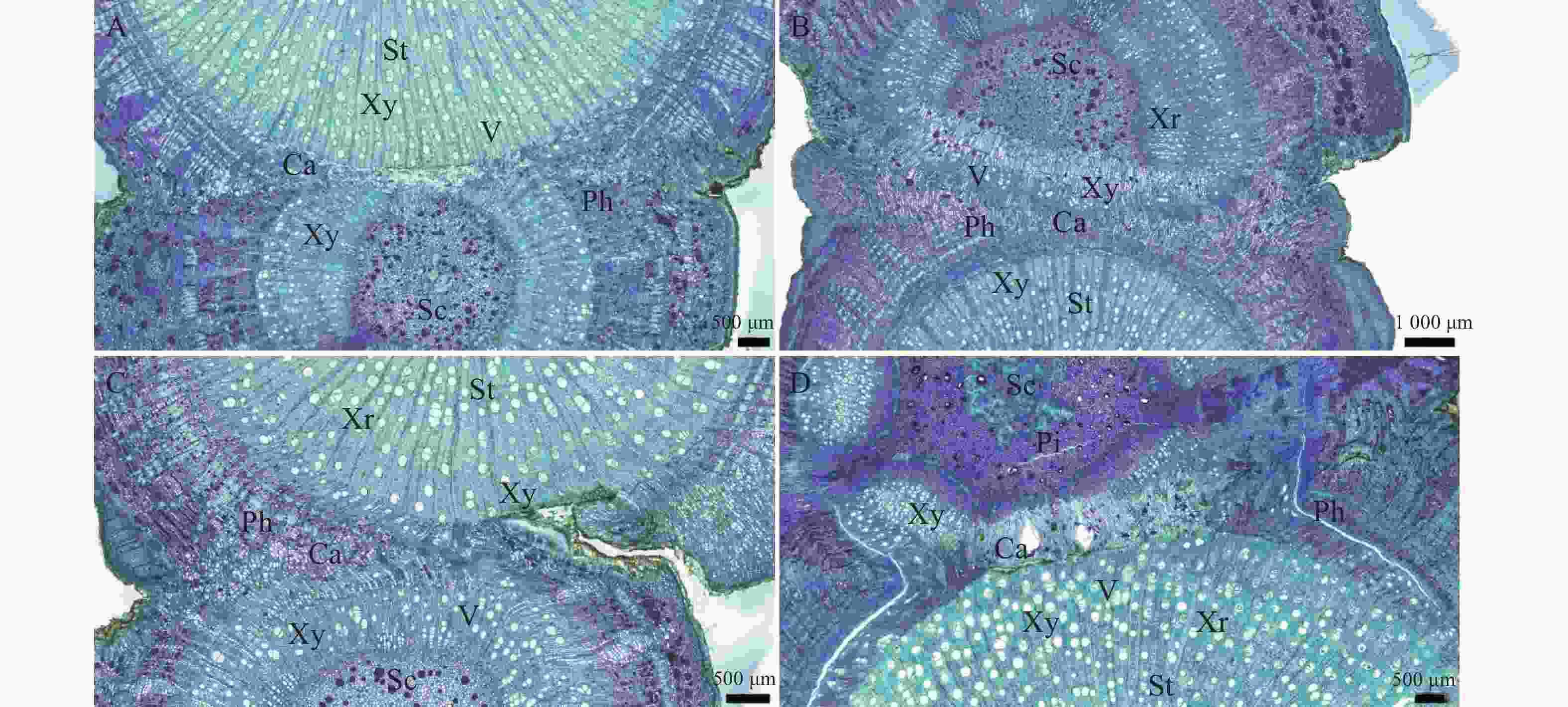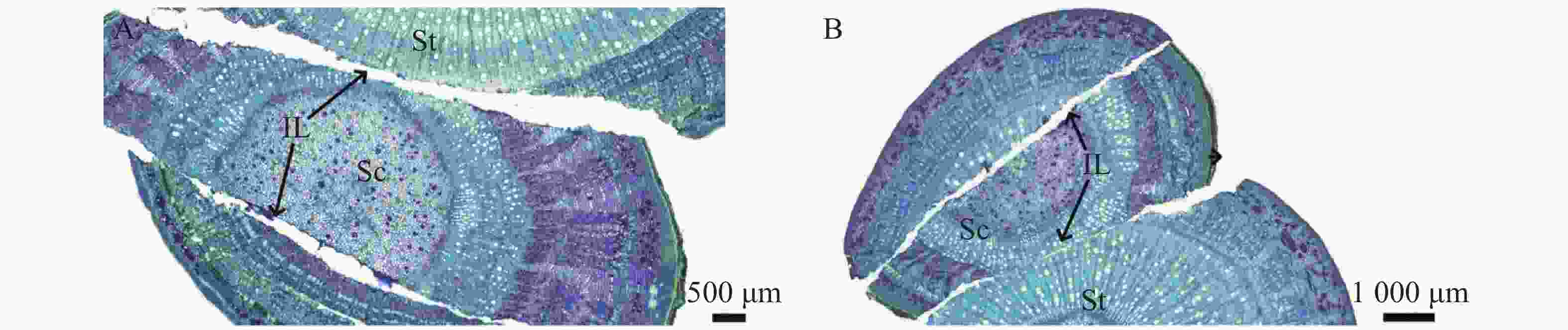 硬组织树脂包埋切磨片实验步骤,样品从固定液中取出,新鲜组织确定取材部位,将植物组织用70%FAA固定48 h,依次通过体积分数60% → 70% → 80% → 90% →95%乙醇脱水,每梯度处理24~72 h,再用T7200树脂浸润20 d。之后将组织放入包埋模具,调整包埋面,加入T7200树脂,光固化12 h,接着进行平行切片。平行粘片后,进行切片磨片,最后将切磨片进行甲苯胺蓝染色,透明封片。染色结果显示,木质化细胞壁呈蓝绿色,纤维素细胞壁呈紫蓝色。将切片置于日本产的Nikon Eclipse E100正置光学显微镜下观察并拍照。