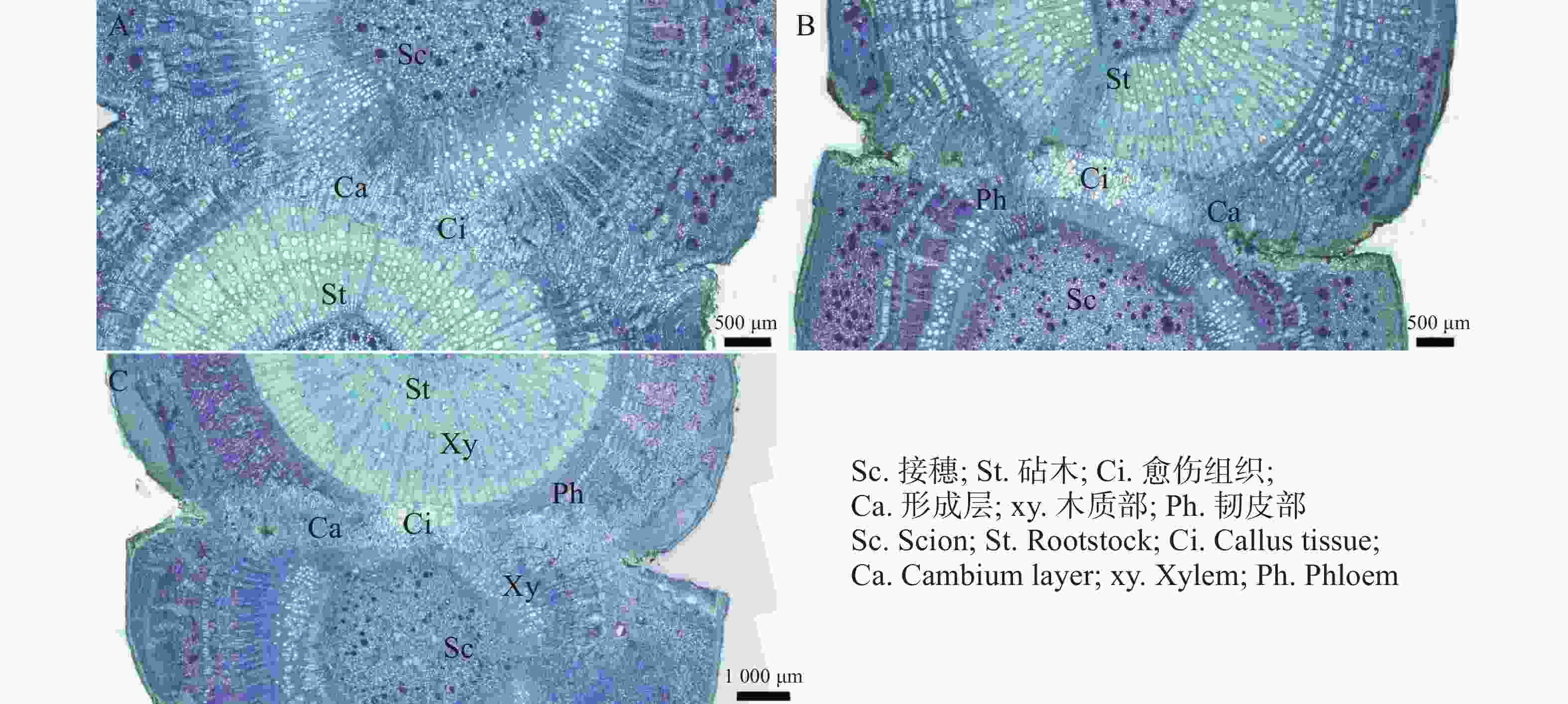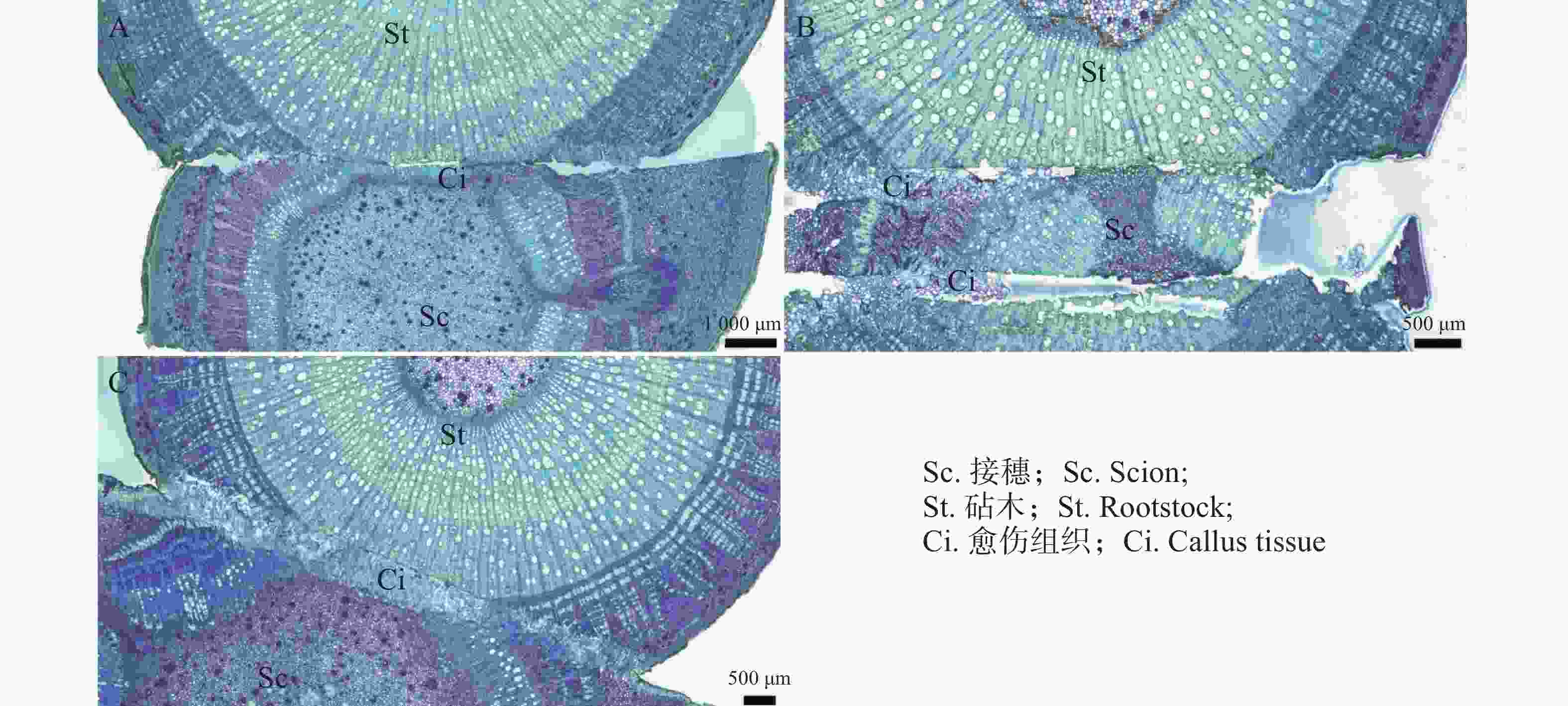 A.Cross-sectional detail of grafting 14 days post-grafting; B. Cross-sectional detail of grafting 18 days post-grafting; C. Cross-sectional detail of grafting 22 days post-grafting.