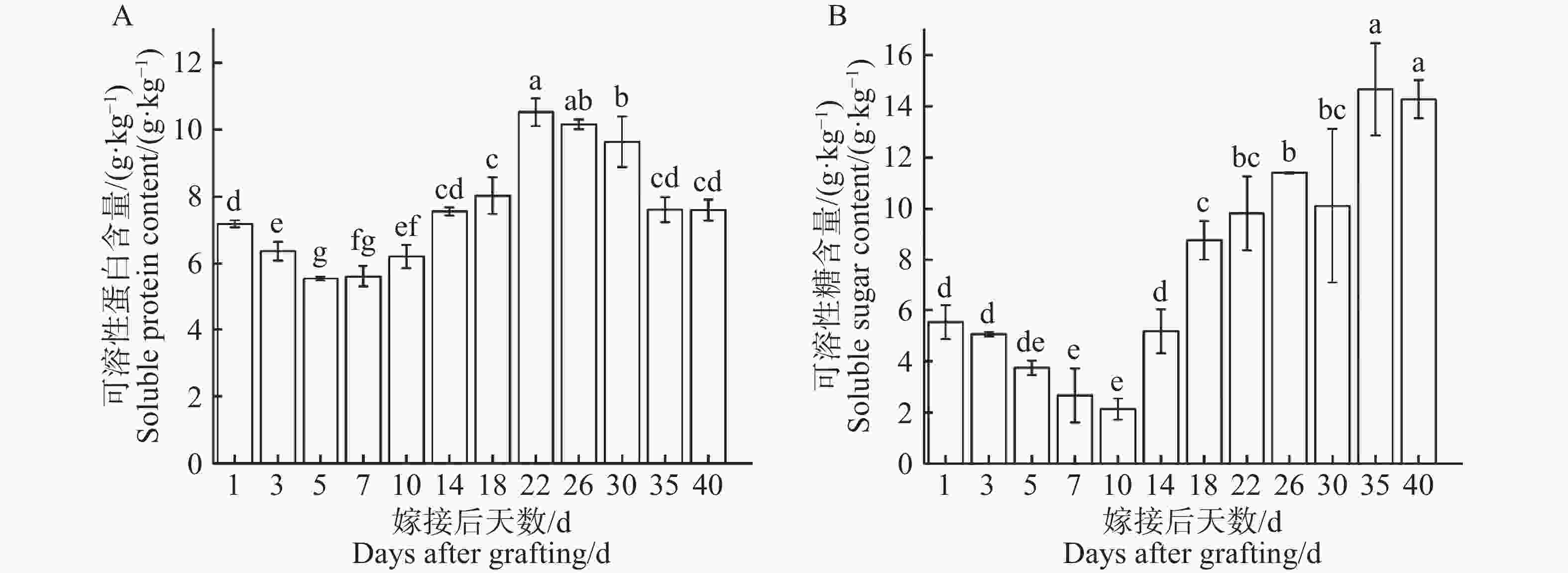 A. Changes in Soluble Proteins during Graft Healing; B. Changes in Soluble Sugars during Graft Healing; Different lowercase letters above the error bars indicate significant differences (P < 0.05) in the values of each parameter at different time points. similarly hereinafter.