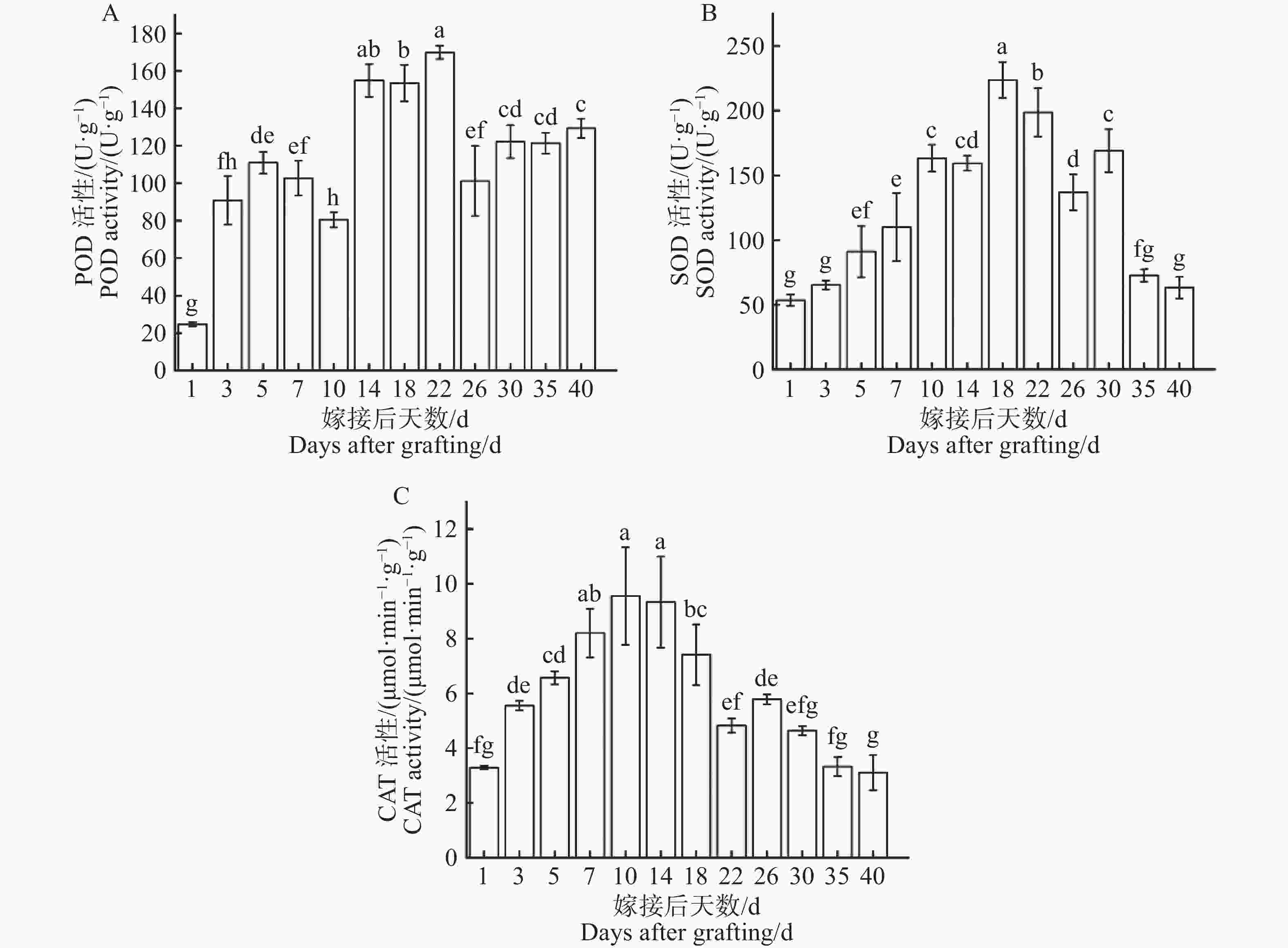 从图7−A可知,过氧化物酶(POD)活性第1天为最低点(24.74 U·g−1),在1~5 d过氧化物酶活性持续上升,在第5天上升至第1个峰值(80.48 U·g−1),随即在第5~10天过氧化物酶活性略微下降,过氧化物酶活性在第10~22天显著上升至最高点(169.87 U·g−1),最高点是最低点的6.87倍,在第22天出现峰值后,过氧化物酶活性在第22~40天显著下降后平稳波动。过氧化物酶活性在整个嫁接愈合过程中呈现先上升后下降,再上升再下降的变化趋势。从图7−B可知,在嫁接后1~18天超氧化物歧化酶(SOD)活性持续上升,在第18天上升至最高点(223.64 U·g−1),随即在第18~40天超氧化物歧化酶活性逐步下降,在第40天显著下降至最低点(63.16 U·g−1),最高点是最低点的3.54倍。超氧化物歧化酶活性在整个嫁接愈合过程中呈现出先上升后下降明显变化趋势。从图7−C可知,在1~10 d过氧化氢酶(CAT)活性持续上升,在第10天上升至最高点(9.55 μmol·min−1·g−1),随即在第10~40天过氧化氢酶活性波动性下降,在第40天显著下降至最低点(3.11 μmol·min−1·g−1),最高点是最低点的3.07倍。过氧化氢酶活性在整个嫁接愈合过程中呈现出先上升后下降的明显变化趋势。