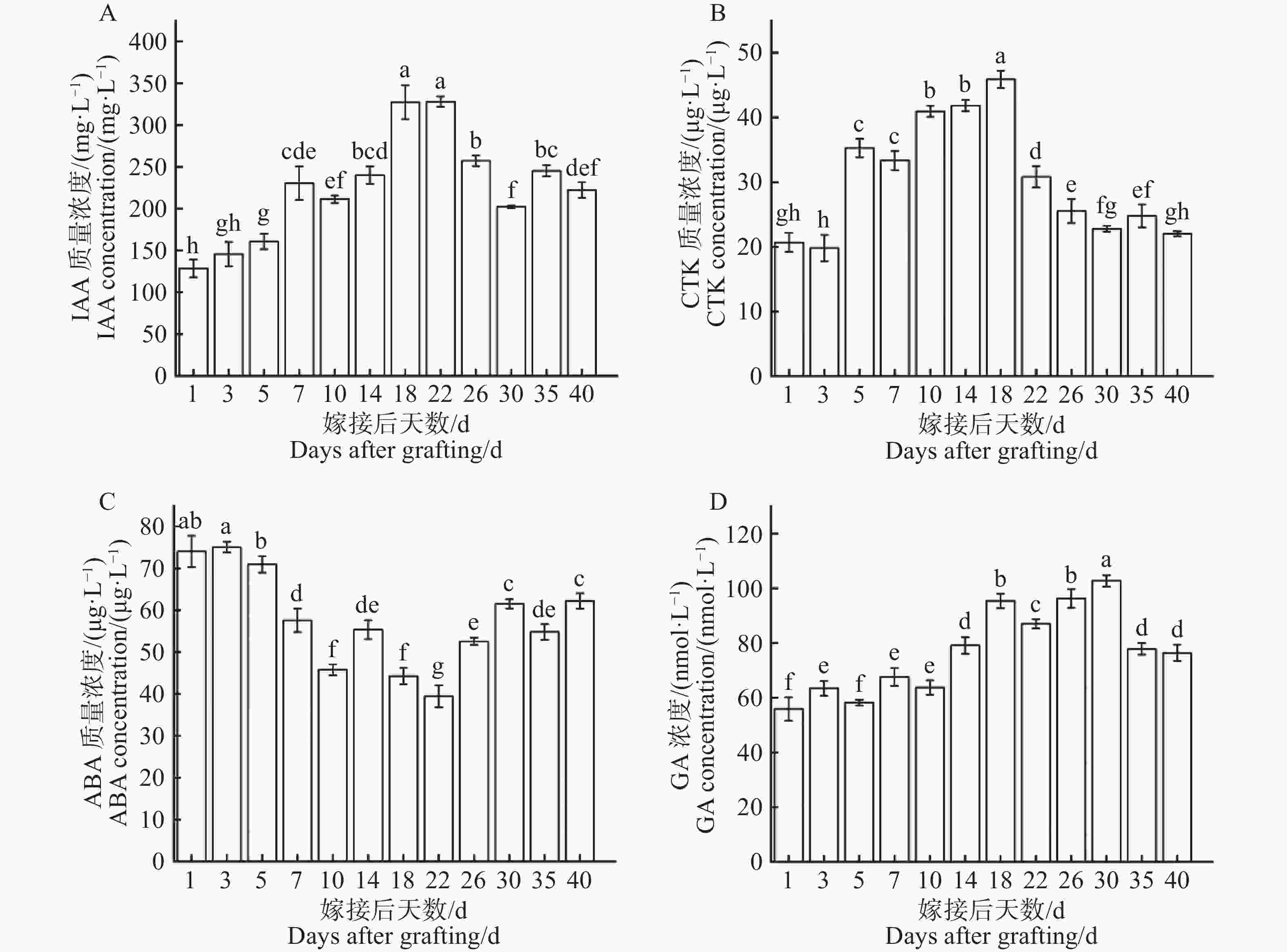 从图8−A可知,在嫁接后1~22 d激素IAA浓度波动上升,在第22天上升至最高点(328.2 mg·L−1),随即在第22~30天激素IAA浓度逐步下降,在第30~40天激素IAA浓度波动起伏逐渐平稳。第1天为最低点(128.7 mg·L−1),最高点是最低点的2.55倍。激素IAA浓度在整个嫁接愈合过程中总体呈现出先上升后下降的变化趋势。如图8−B所示,在1~18 d激素CTK浓度持续上升,在第18天上升至最高点(45.89 μg·L−1),随即在第18~22 d激素CTK浓度急剧下降,在第22~40 d激素CTK浓度波动起伏逐渐平稳,第3 d为最低点(19.79 μg·L−1)最高点是最低点的2.32倍。激素CTK浓度在整个嫁接愈合过程中总体呈现出先上升后下降的变化趋势。从图8−C可知,在1~22 d激素ABA浓度持续下降,在第22天下降至最低点(39.41 μg·L−1),随即在第22~40天激素ABA浓度波动性上升,第3天为最高点(75.08 μg·L−1),最高点是最低点的1.91倍。激素ABA浓度在整个嫁接愈合过程中呈现出先下降后上升的明显变化趋势。如图8−D所示,在1~30 d激素GA浓度波动性上升,在第30天上升至最高点(102.7 nmol·L−1),随即在第30~40 d激素GA浓度急剧下降,第1天为最低点(55.87 nmol·L−1),最高点是最低点的1.84倍。激素GA浓度在整个嫁接愈合过程中呈现出先上升后下降的变化趋势。