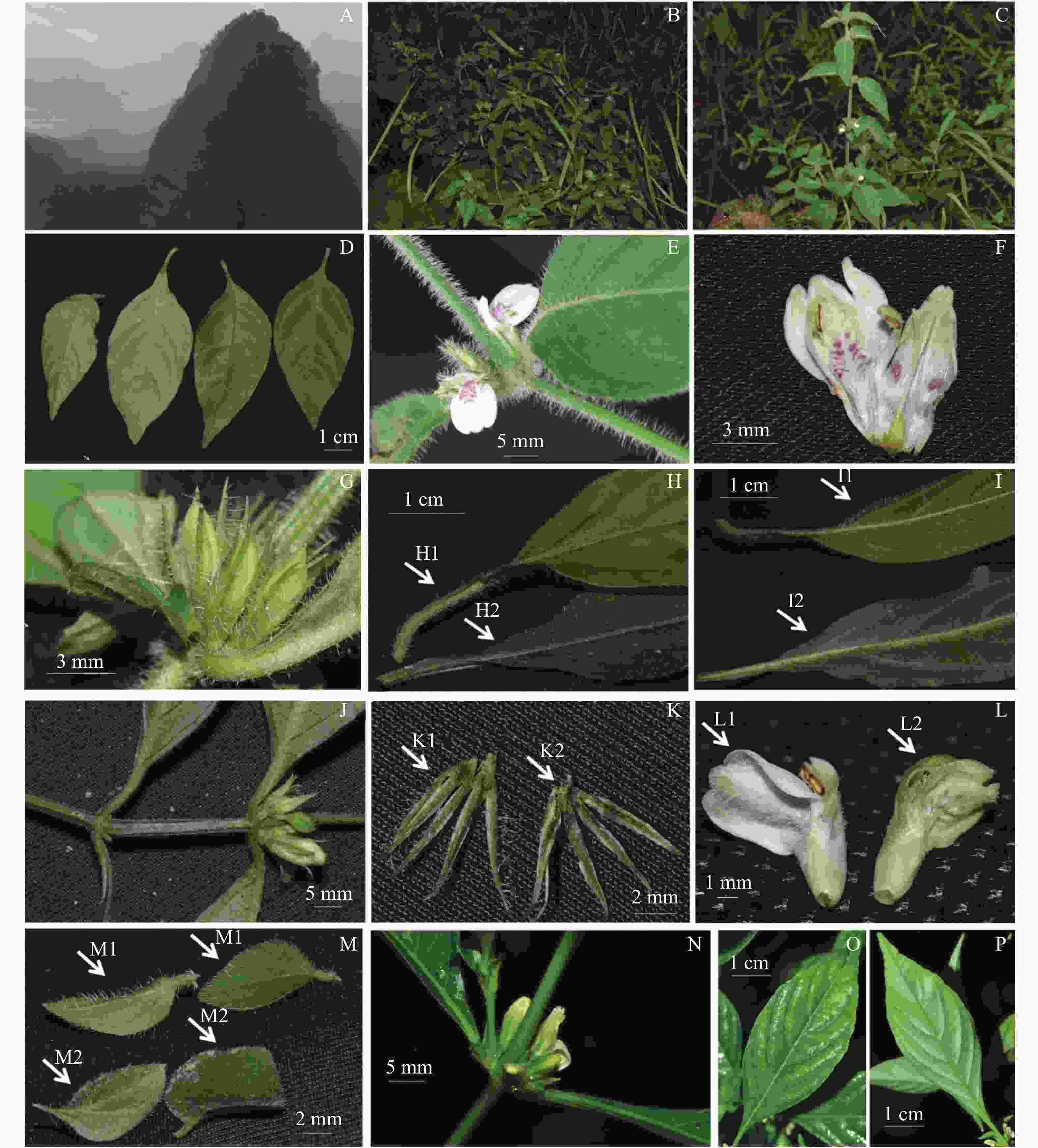 • 2022—2024 年,对该未知种群进行了连续3年的监测和观察。在野外对该种群进行了植物摄影,测量了数量性状。对CVH(https://www.cvh.ac.cn/)和GBIF(https://www.gbif.org/)上提供的爵床属物种的数字照片和标本照片进行了系统比较。