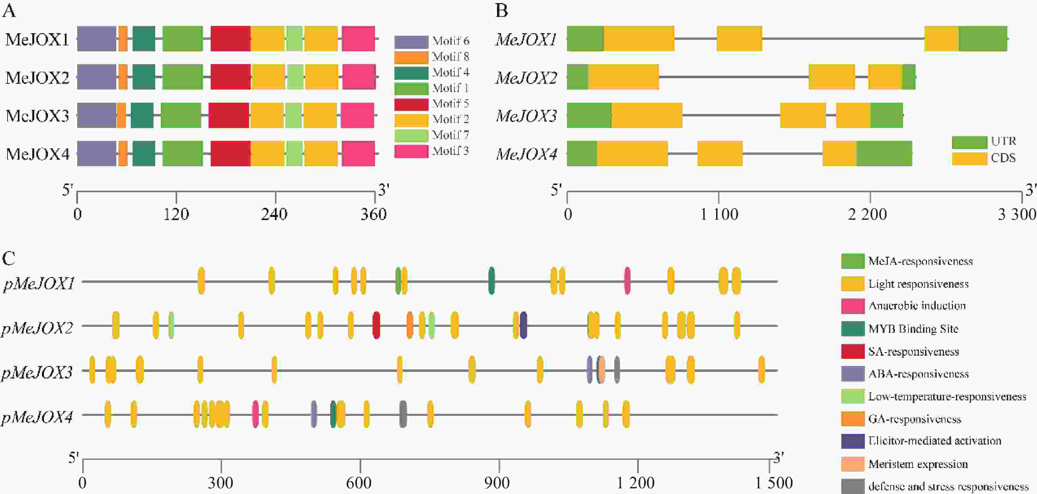 • 通过MEME对MeJOXs家族蛋白分析共发现8个保守的motif基序,每个成员间含有相似的motif分布(图4-A)。通过对MeJOXs家族成员基因结构分析发现,各个成员均包含5个外显子,2个内含子,其中3个外显子编码CDS区,其余2个为5´UTR和3´UTR非翻译区。此外,进化树中聚到同一类群的MeJOXs基因显示出相似的基因结构, MeJOX2MeJOX3都表现出第1个内含子较长、第2个内含子较短的基因结构,而MeJOX1MeJOX4第1个内含子较短,第2个内含子均较长(图4-B)。