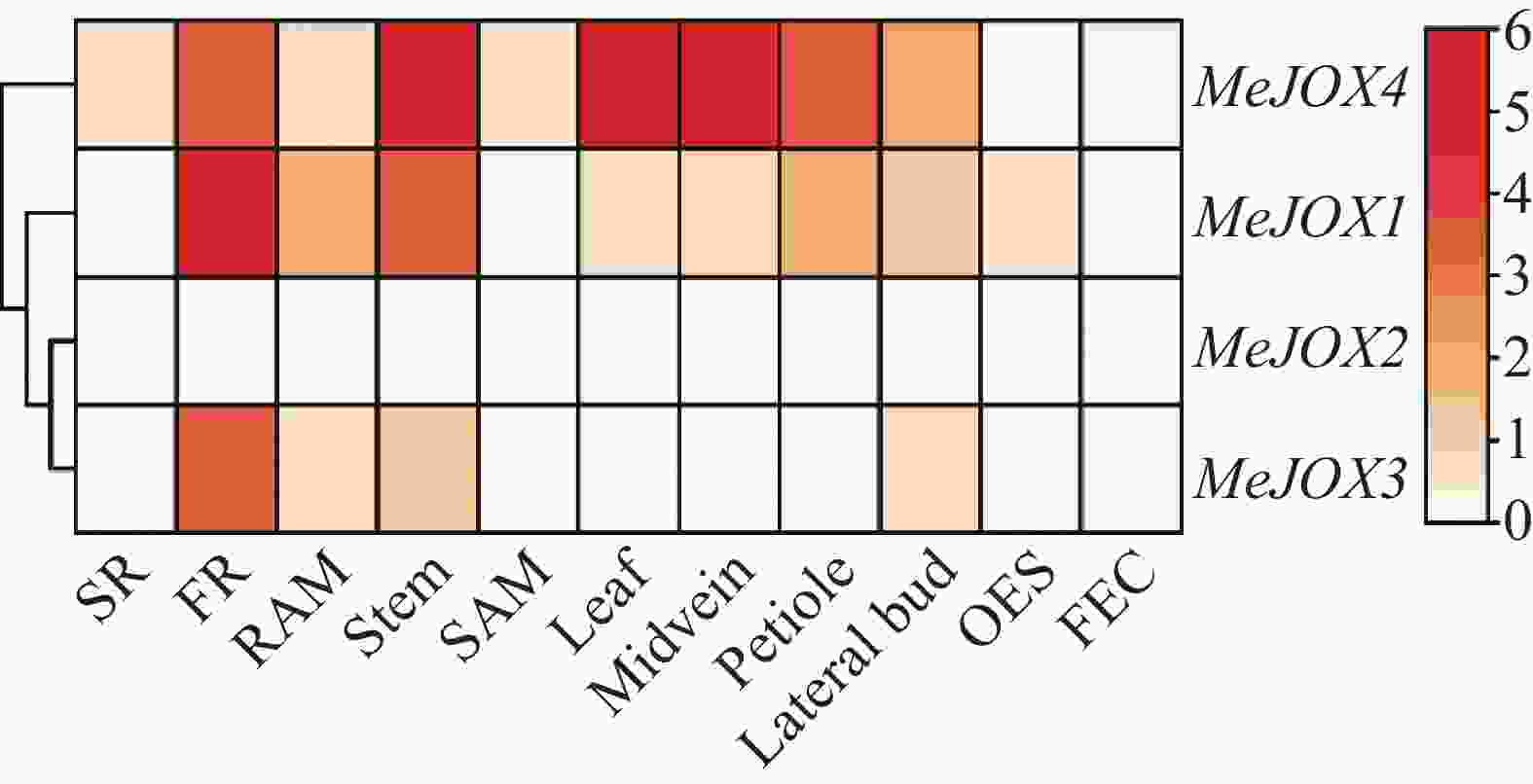 • 为了探究木薯MeJOXs家族基因的表达是否存在组织特异性,本研究利用木薯11种不同组织部位(块根、须根、根尖分生组织、茎、茎尖分生组织、叶片、叶中脉、叶柄、腋芽、体胚、脆性胚性愈伤组织)的公开转录组对MeJOXs的表达量TPM值进行log2(TPM+1)对数转换后绘制热图(图5)。结果显示,除MeJOX2在11种木薯组织中几乎均不表达外,其余3个MeJOXs家族成员在不同组织中具有不同的表达模式, MeJOX1在须根中显著高表达,MeJOX4在茎、叶片及叶中脉中均显著高表达,在须根、叶柄及腋芽中也有表达,MeJOX3在须根中有表达,但不如前两者。以上结果表明,在木薯不同组织生长发育过程中MeJOXs家族不同成员可能发挥不同的作用。