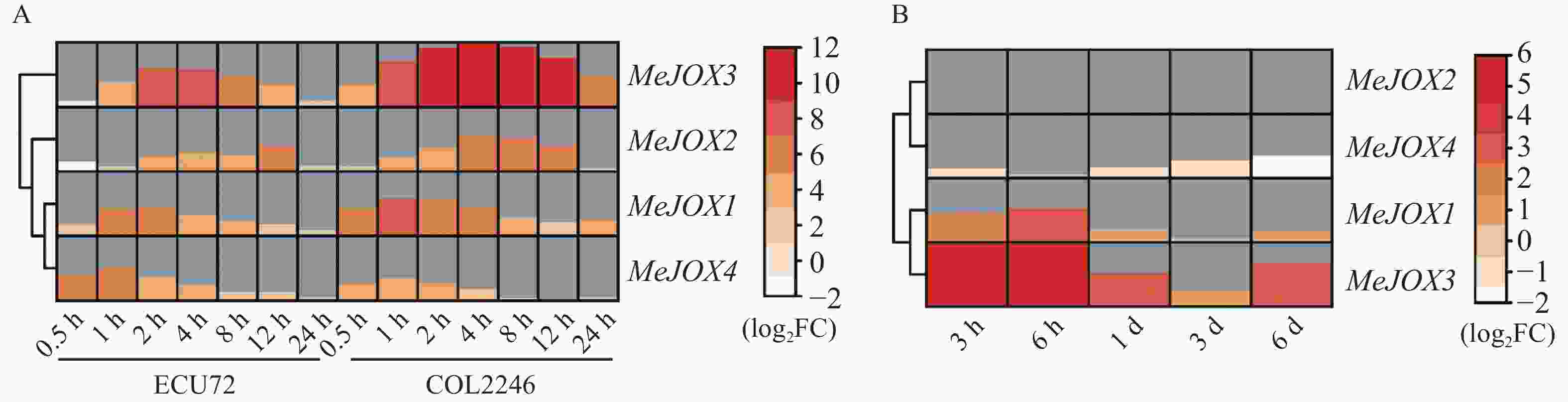 • 由于拟南芥AtJOXs基因均显著受到植物激素MeJA诱导表达,因而利用MeJA处理木薯种质ECU72、 COL2246的转录组分析了木薯MeJOXs家族基因在MeJA处理下的差异表达情况。结果如图6-A所示,在MeJA处理后木薯MeJOXs家族基因均能够响应且不同的时间点存在较为明显的差异表达(|log2 FC| ≥ 1且FDR≤0.05),MeJOX1/4层次聚类为一类,在2种木薯种质中表达模式更为接近,相对于MeJOX2/3,前两者在2种种质中MeJA处理0.5 h后即有明显上调表达趋势,处理后1~2 h表达达到峰值,随后表达逐渐下降;后两者在ECU72种质中,MeJA处理0.5 h后二者表达甚至稍呈下调趋势(log2 FC = −1.2或−0.6),随后表达才逐渐上调,2~4 h达到峰值后逐渐降低,但MeJOX2在MeJA处理12 h后表达水平还存在一个峰值起伏(log2 FC = 5.0)。同一层次聚类分支的基因之间表达模式也存在一些区别,例如MeJOX1在COL2246种质中受MeJA诱导表达幅度更大且更早达到峰值(1 h,log2 FC = 7.0),而MeJOX4在ECU72种质中受诱导表达幅度更大且更早达到峰值(1 h,log2 FC = 6.2)。除此之外,MeJOX2/3虽然在对应种质中表达模式较为相似,但MeJOX3在MeJA处理后多个时间点表达量上升幅度明显高于其他3个MeJOXs基因,且在COL2246种质中MeJA处理4 h后表达受诱导最为明显(log2 FC = 11.8)。以上结果说明,木薯MeJOXs家族基因受植物激素JA诱导表达。