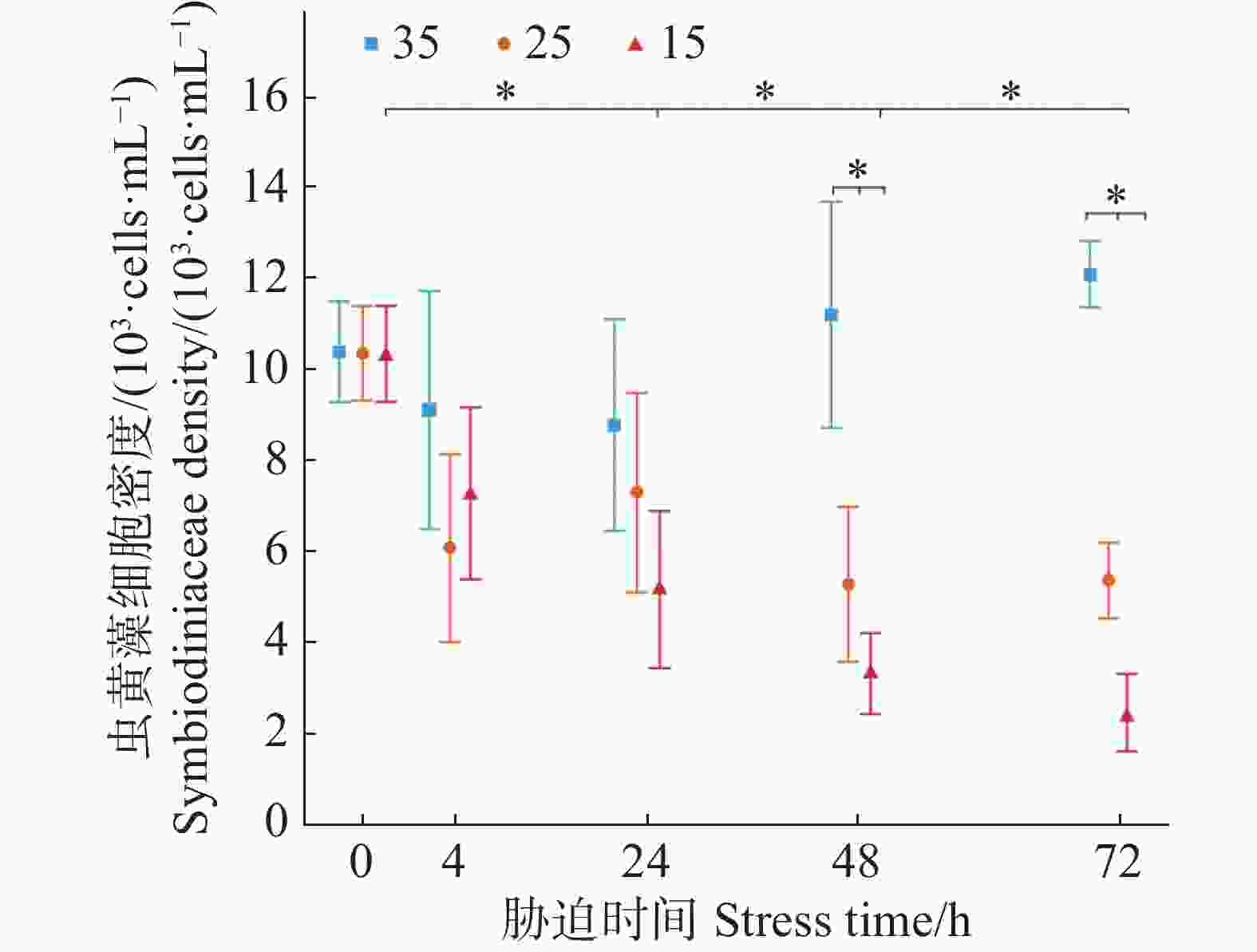 • 本实验将正常条件培养盐度为35的虫黄藻作为对照组,盐度条件改变为25、15培养的虫黄藻作为胁迫实验组。虫黄藻的初始理论接种浓度控制在1 × 104 cells·mL−1。从图1可知,盐度35正常条件培养下的虫黄藻密度在72 h内有较为稳定的上升趋势但不显著,25的低盐胁迫下在72 h内虫黄藻密度变化不显著,而15的低盐胁迫下虫黄藻密度变化呈现不断下降趋势且在第48 h已显著低于的初始阶段(P = 0.045)。在48 h时,25与15盐度下的虫黄藻密度均已显著低于35盐度下的虫黄藻密度(P < 0.05)。
