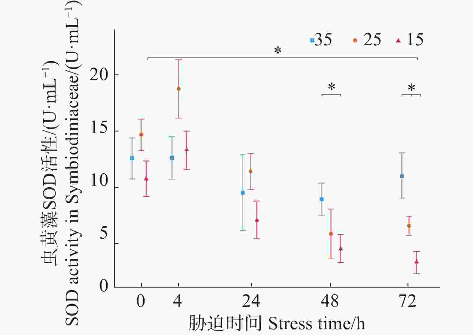 • 图3所示,3个盐度梯度(35、25、15)的虫黄藻SOD初始活力分别为(12.57±1.83)、(14.68±1.39)、(10.74±1.59 )U·mL−1,低盐胁迫实验组的平均值在4 h时要高于对照组但两者的差异性并不显著。在随后的24 h与48 h,低盐胁迫实验组呈现不断下降趋势;盐度25实验组在72 h时与48 h持平,而盐度15实验组则仍在下降。在胁迫48、72 h时胁迫实验组中盐度25和15的SOD活力均小于初始阶段的虫黄藻的SOD活力(P < 0.05),且均小于对照组中盐度35的SOD在胁迫了48、72 h的虫黄藻SOD活力。