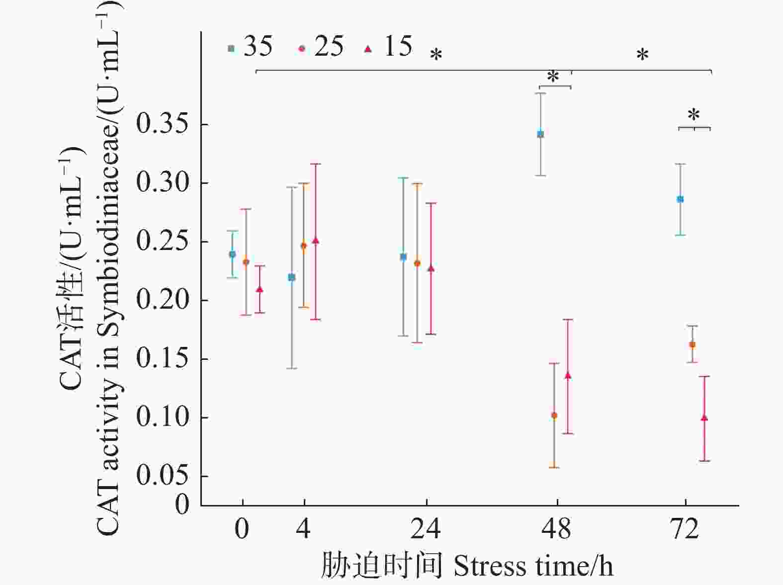 • 图4所示,3个盐度梯度(35、25、15)的虫黄藻CAT初始活力分别为(0.24±0.02)、(0.23±0.04)、(0.21±0.02)U·mL−1,低盐胁迫实验组的平均值在4 h要高于对照组,但两者的差异不显著。在随后的24与48 h,低盐胁迫实验组则呈现不断下降趋势。在72 h时,25盐度实验组CAT活性略有上升,而盐度15实验组仍在下降。在胁迫48、72 h时,胁迫实验组中盐度25和15的CAT活力均显著小于正常培养盐度35条件下对照组虫黄藻的CAT活力(P < 0.05)。