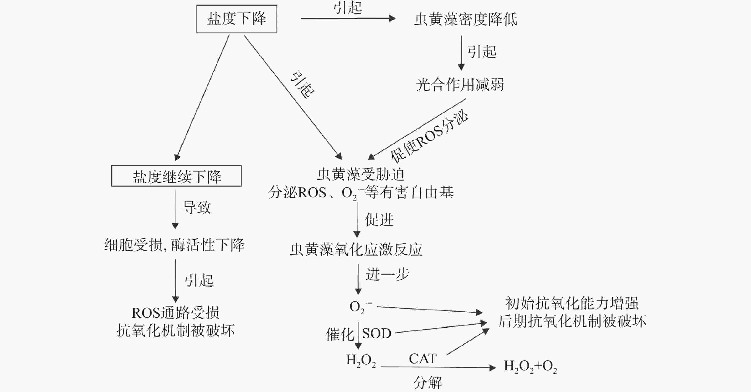 综上所述,面对低盐胁迫,E. voratum的响应模式如图5所示。低盐胁迫下,虫黄藻E. voratum的生长受到抑制,光合作用减弱,产生氧化应激反应,出现活性氧分子等有害自由基积累,抗氧化酶SOD与CAT活性初期升高,增强了虫黄藻的抗氧化能力,后期抗氧化机制被破坏。极端低盐环境下,细胞受损,酶活性下降,ROS通路受损,导致抗氧化机制被破坏。