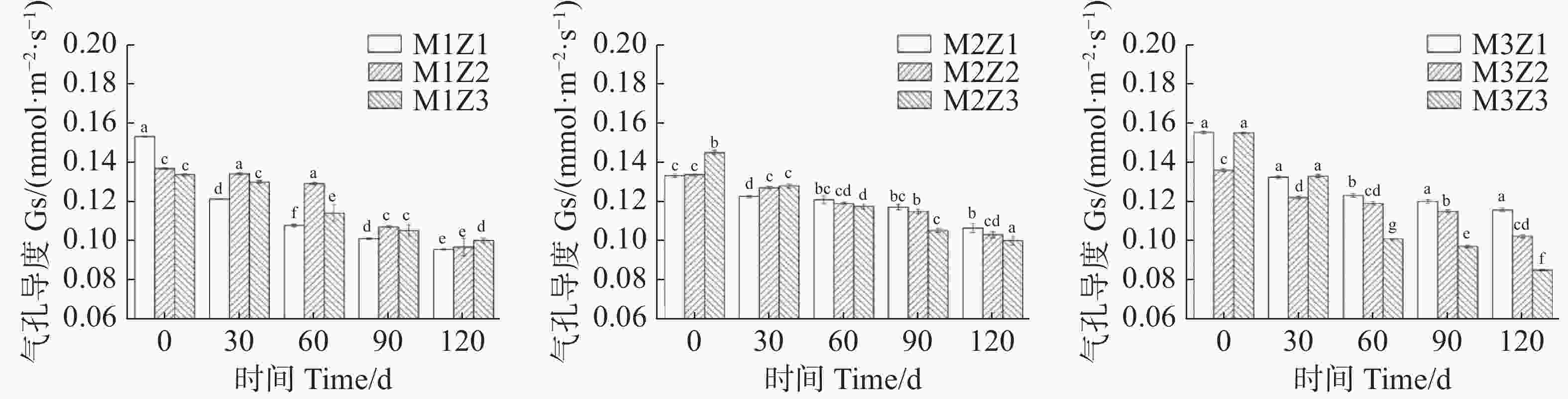 • 正常处理下‘海贡蕉’幼苗净光合速率Pn图7)、蒸腾速率Tr图8)、胞间CO2浓度Ci图9),随着生长期的延长呈上升趋势,气孔导度Gs图10)呈下降趋势。协同缺乏处理下,‘海贡蕉’幼苗Pn值增长缓慢,但Ci值却显著高于正常处理,协同缺乏处理下,Tr值、Gs值呈明显下降趋势,Tr值明显低于正常处理,但Gs却高于正常处理。生长第120天,正常处理下幼苗Pn值为11.68 µmol·m−2·s−1,M1Z1、M1Z2、M1Z3、M2Z1、M2Z2、M2Z3、M3Z1、M3Z2处理较正常处理分别降低了64.70%、60.96%、57.27%、57.45%、58.48%、56.16%、26.03%、19.42%;正常处理下Tr值为0.000166 mmol·m−2·s−1,协同缺乏处理下较正常处理分别低了68.45%、67.85%、67.80%、61.87%、61.77%、62.00%、61.95%,但M3Z2处理Tr值却高于正常处理;正常处理下Ci值为 270.1 μL/L,M1Z1、M1Z2、M1Z3、M2Z1、M2Z2、M2Z3、M3Z1、M3Z2协同缺乏处理下Ci值较正常处理值分别高了14.07%、10.78%、11.50%、7.44%、6.11%、10.36%、5.92%、8.88%。正常处理下Gs值为0.085 mmol·m−2·s−1,协同缺乏处理下Gs值分别比正常处理高了12.24%、13.65%、17.65%、25.18%、21.18%、17.65%、36%、20.19%。