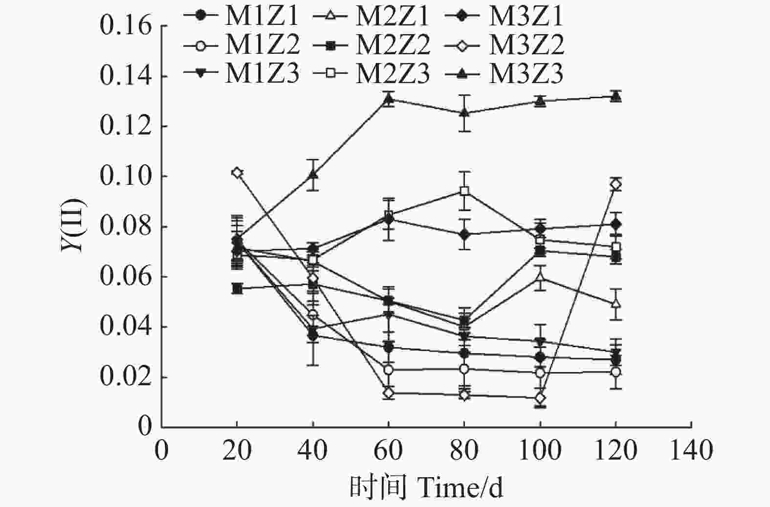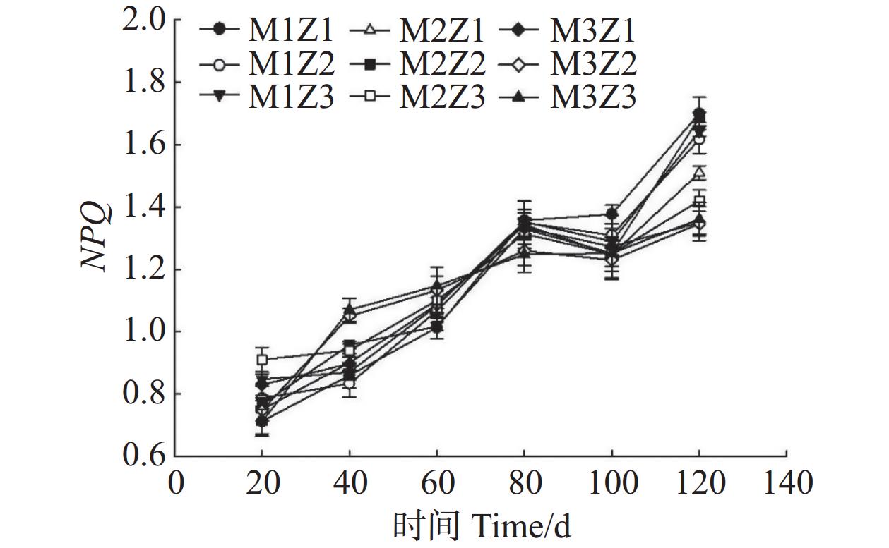 • 图11图13可知,正常处理下Fv/Fm值呈现出稳定的变化趋势。在第0~120天,Fv/Fm值仅增长了0.06。M1Z1、M1Z2、M1Z3、M2Z1、M2Z2、M2Z3、M3Z1、M3Z2处理下,Fv/Fm值分别较正常处理降低了15.88%、16.41%、18.42%、18.38%、12.75%、11.49%、13.09%、1.58%。且协同缺乏程度越轻,Fv/Fm值的变化越小。正常处理下‘海贡蕉’幼苗的Y(Ⅱ)值呈现“先上升,后稳定波动”的趋势,Y(Ⅱ)值从第0天的0.08增长至第120天的0.23,M3Z2与正常处理变化相似,但Fv/Fm值显著低于正常处理。M1Z1、M1Z2、M1Z3处理下,‘海贡蕉’幼苗Y(Ⅱ)值呈下降趋势,第0~40天下降较快,随后缓慢下降,表现为M1Z2<M1Z1<MZ1Z3。M2Z1、M2Z2在生长第0~80天时,Y(Ⅱ)值呈下降趋势随后波动上升,M2Z3、M3Z1处理下Y(Ⅱ)值呈“下降–上升–下降”趋势。正常处理下Y(Ⅱ)值为0.23,生长期内第20~120天,各缺乏处理下该值均显著低于正常处理。NPQ值随着生长期的延长,整体呈波动上升趋势。正常处理下,NPQ值呈稳定上升趋势。协同缺乏处理下,生长第0~80天呈上升趋势,第80~100天呈下降趋势,生长第100~120天继续上升,在协同缺乏第120天,正常处理的NPQ值为1.361。其中,M3Z1、M3Z2的处理组NPQ值与正常处理组差异较小,分别为1.35001.3467;M1Z1、M1Z2、M1Z3、M2Z1、M2Z2、M2Z3处理下NPQ值较正常处理分别高了24.89%、18.80%、20.70%、10.93%、23.94%、4.32%,明显高于正常处理组。