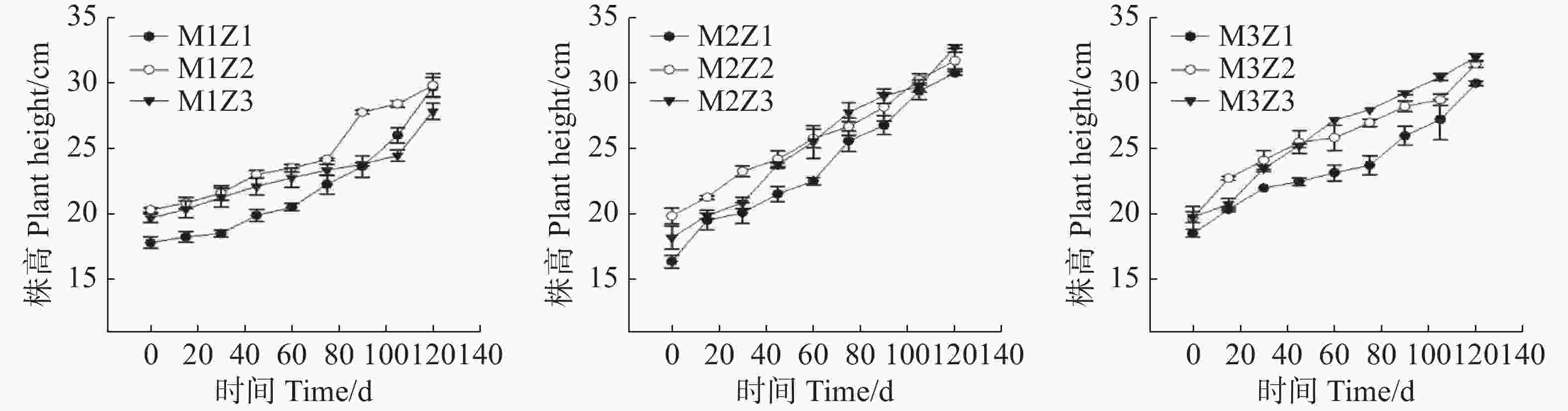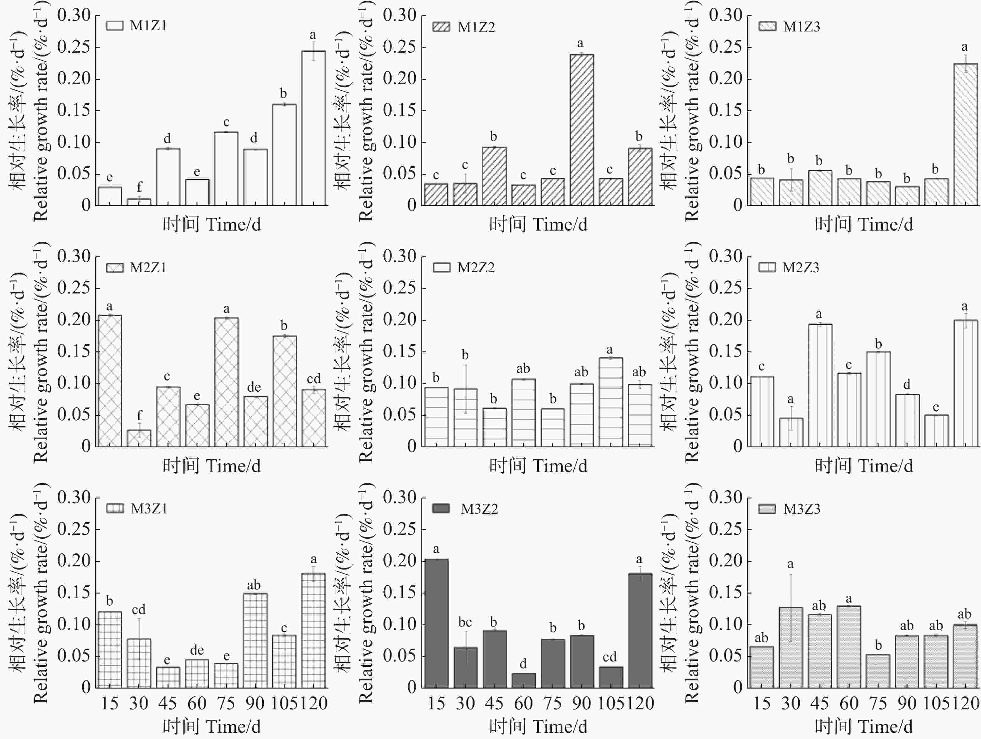 • 实验期内,不同处理下‘海贡蕉’幼苗株高生长动态趋势基本一致,呈现上升趋势(图1),但M1Z1、M1Z2和M1Z3协同缺乏处理下‘海贡蕉’幼苗株高较矮且生长缓慢,虽然M3Z1处理和M3Z2处理株高长势优于其他处理,但也低于正常处理。镁完全缺乏(M1Z3)、锌完全缺乏(M3Z1)处理下,‘海贡蕉’幼苗株高显著低于正常处理。镁、锌协同缺乏处理(M1Z1、M1Z2、M2Z1、M2Z2、M2Z3、M3Z2)第30天,M1Z1处理的株高仅为20.3 cm,为所有处理组中最低。生长第120天,正常处理的‘海贡蕉’幼苗株高为32 cm,M1Z1、M1Z2、M1Z3、M2Z1、M2Z2、M3Z1、M3Z2协同缺乏下的‘海贡蕉’幼苗株高分别较正常处理降低了7.28%、6.88%、13.03%、3.91%、0.94%、6.25%、1.56%。M2Z3处理下株高比正常处理高2.34%。镁锌协同缺乏处理对幼苗株高相对生长率的影响复杂且具有阶段性(图2)。生长期内,不同处理下‘海贡蕉’株高相对生长率保持在0.011 6~0.244 9,变化幅度较大。其中,镁锌完全缺乏(M1Z1)处理下,株高相对生长率整体偏低,生长受严重抑制且不稳定;正常处理下株高相对生长率较高;其他缺乏处理下,株高相对生长率变化波动较大,无明显规律,但总体来看,低于正常处理组。此外,相对生长率不会随生长时间变化而呈现一定的趋势。