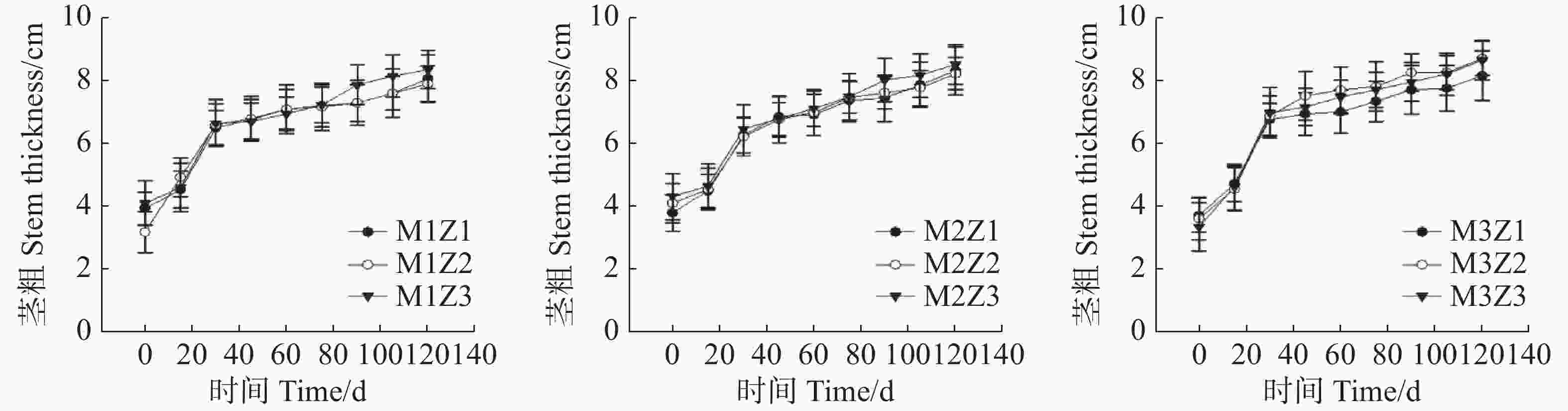 • 生长0~120天,不同处理下‘海贡蕉’苗茎粗呈现出相似的增长趋势(图3)。生长第120天,正常处理‘海贡蕉’幼苗茎粗达到8.65 cm。协同缺乏处理下,M1Z1协同缺乏处理下的‘海贡蕉’幼苗茎粗为8.07 cm,M1Z2处理下为7.90 cm,M1Z3处理下为8.35 cm,M2Z1处理下为8.30 cm,M2Z2处理下为8.20 cm,M2Z3处理下为8.50 cm,M3Z1处理下为8.15 cm,M3Z2处理下为8.70 cm。整体来看,在幼苗生长期间,镁、锌协同缺乏对‘海贡蕉’幼苗茎粗生长影响较小,‘海贡蕉’幼苗茎粗不会随着缺乏程度及缺乏时间而表现出明显差异。