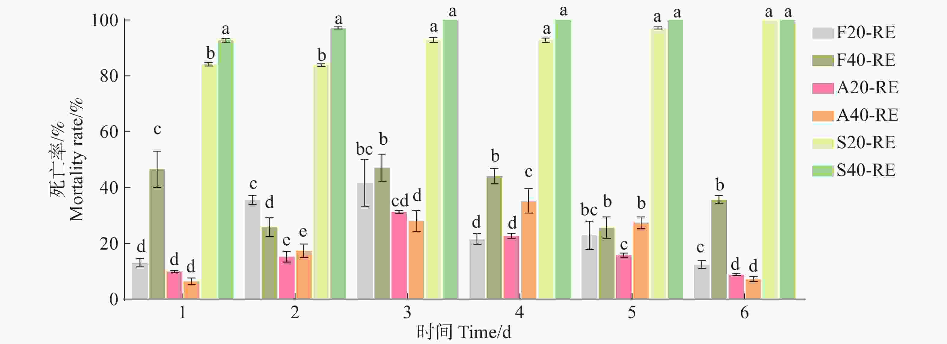 番茄喷施杀线剂后不同时段提取的RE对J2s的致死效果差异显著(图3)。噻唑磷处理组对J2s的致死效果显著高于阿维菌素和氟吡菌酰胺,S20-RE对J2s的致死率随着RE获取时间的延长而上升,至第6天达100%,而S40-RE在第3天致死率就达100%。F40-RE在第3天达到峰值,为47.12%,A40-RE在第4天达到峰值,仅为35.21%,两者均显著低于噻唑磷。