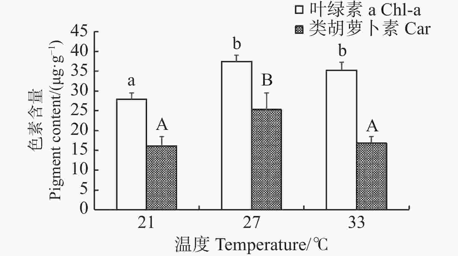 当光照强度统一设置为4 000 lx时,长心卡帕藻在不同温度条件下进行室内培养,随着温度的升高藻体叶绿素a和类胡萝卜素的含量均呈先上升后下降的变化(图2)。温度为21 ℃的试验组藻体的叶绿素a含量显著低于其他两组(P<0.05),为(27.86±1.66)μg·g−1;在温度为27 ℃时,长心卡帕藻的叶绿素a和类胡萝卜素含量均达到最高值,类胡萝卜素的含量显著高于其余两组(P<0.05),含量为(25.28±4.22)μg·g−1,但27 ℃和33 ℃两个试验组叶绿素a的含量之间差异不显著(P>0.05)。