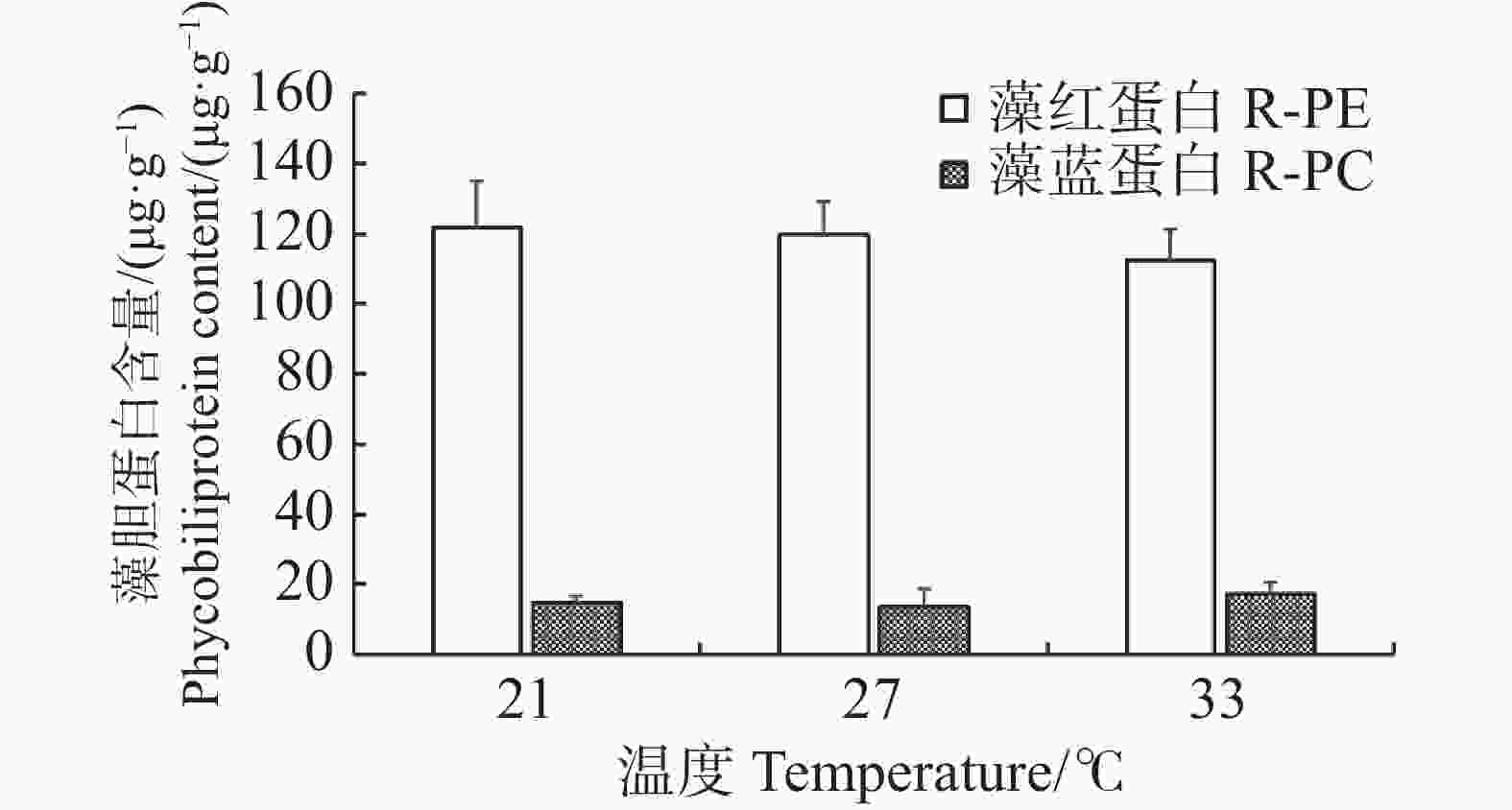 随着温度的变化,长心卡帕藻藻体的藻红蛋白和藻蓝蛋白含量变化幅度并不大,在21、27、33 ℃的藻红蛋白含量分别为(121.68±13.58)、(119.88±9.33)、(112.56±17.36)μg·g−1,藻蓝蛋白的含量分别为(14.93±1.91)、(13.61±5.32)、(17.36±3.22)μg·g−1,相互间并无显著差异(P>0.05)(图3)。各温度处理组中藻体的藻红蛋白含量均高于藻蓝蛋白含量,且藻红蛋白的含量随着温度升高略有降低。