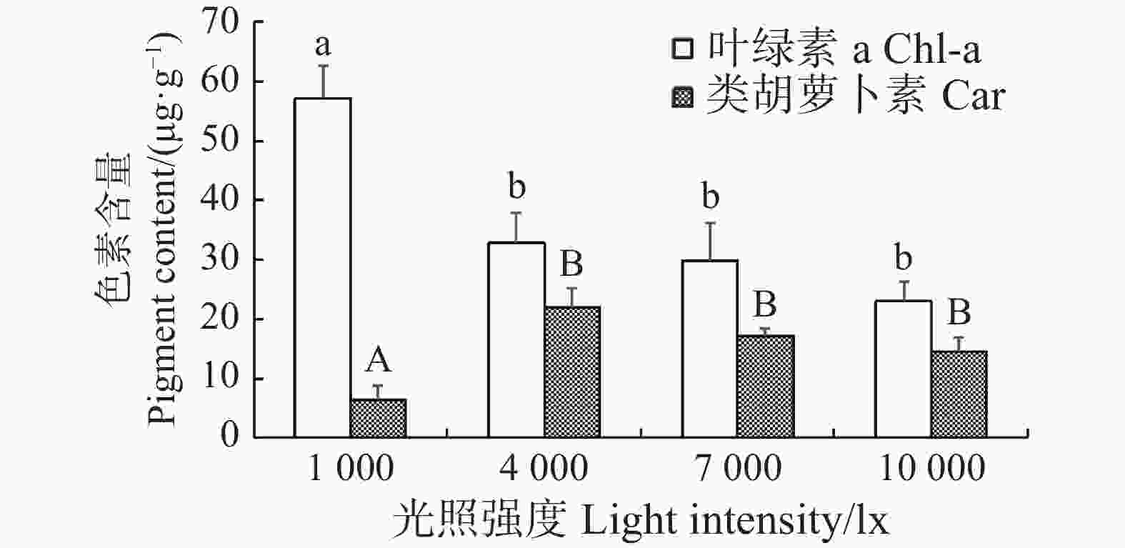 在不同光照条件下进行室内培育21 d后,长心卡帕藻藻体的叶绿素a和类胡萝卜素含量也呈现出差异性。当光照为1 000 lx时,长心卡帕藻的外植体枝段的叶绿素a含量为(57.11±5.40)μg·g−1,显著高于其他光照组(P<0.05),但类胡萝卜素的含量为(6.43±2.31)μg·g−1,显著低于其余组(P<0.05)。在光照强度为4 000~10 000 lx 时,藻体叶绿素a和类胡萝卜素的含量呈小幅下降的趋势,光照强度升高反而抑制色素的积累,但它们之间差异并不显著(图4)。