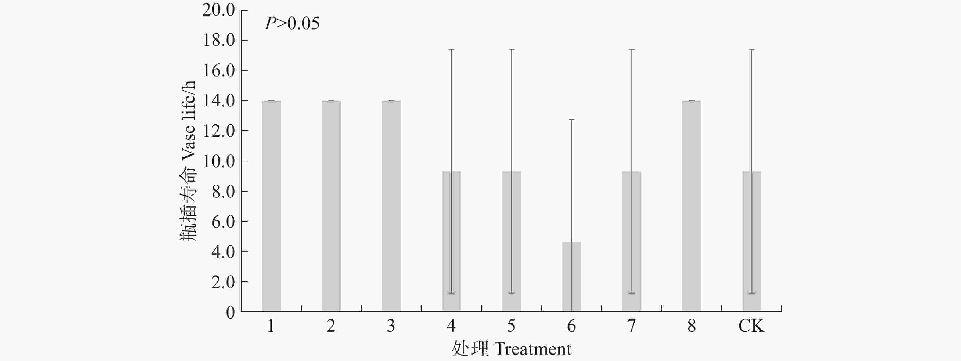 如图1所示,由于各处理中盛花期紫玉兰花朵均在14 h后开始凋谢,故盛花期仅记录第14 h时各处理的鲜质量比。第14 h时盛花期紫玉兰花朵鲜质量比在各处理中无显著差异(P > 0.05)。除处理5和6的鲜质量比(0.95和0.94)小于1外,其余各处理均大于1。如图2所示,盛花期紫玉兰花朵寿命在各处理中无显著差异(P > 0.05)。总体而言,保鲜剂对盛花期紫玉兰花朵鲜质量和寿命无明显影响。