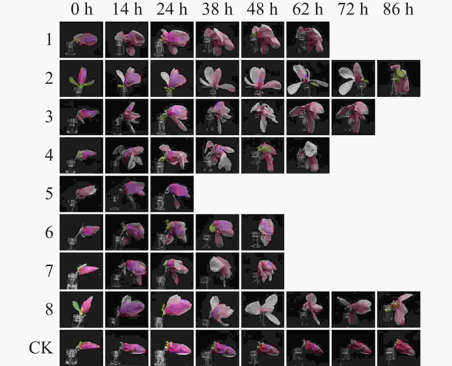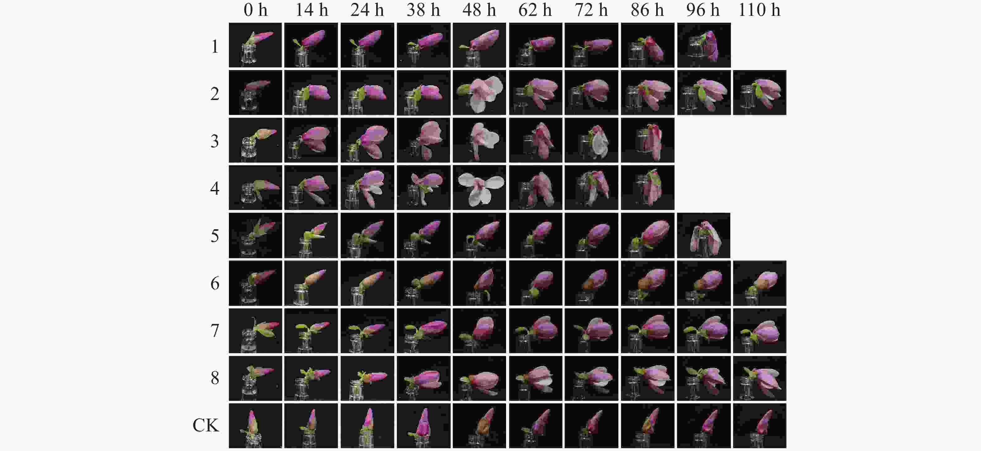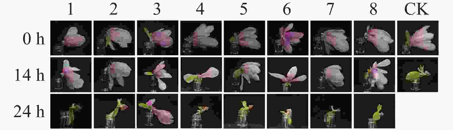 如图3所示,不同处理间盛花期紫玉兰切花的衰败进程无显著差异。其中处理1、2、3、5、7和8的盛花期紫玉兰切花均只维持至14 h,而后迅速凋谢,花被片掉落;处理4、6、CK花被片14 h即进入凋谢阶段。