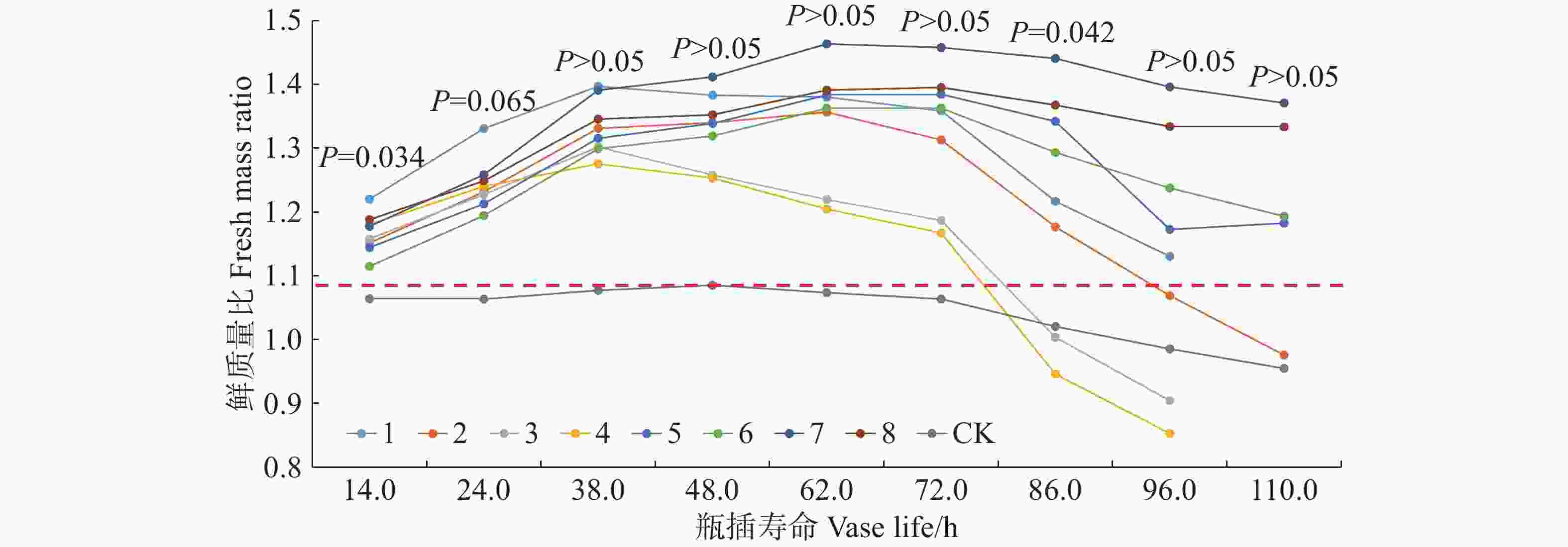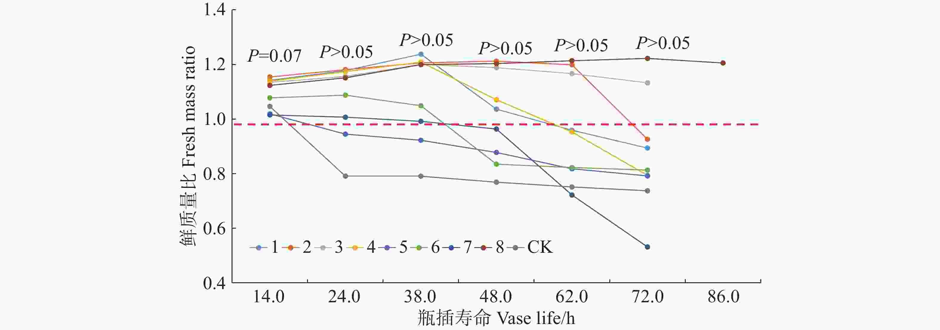 注:图中橙色虚线为纵坐标=1的参考线,图中线段斜率为正表明处于吸水阶段,鲜质量增加;斜率为负且鲜质量比 > 1则表明处于失水阶段,鲜质量减少;斜率为负且鲜质量比 <1则表明花被片已经开始凋谢,鲜质量减少。图中P <0.05表明对应时间各处理间差异显著,P > 0.05表明对应时间各处理间差异不显著。下同。