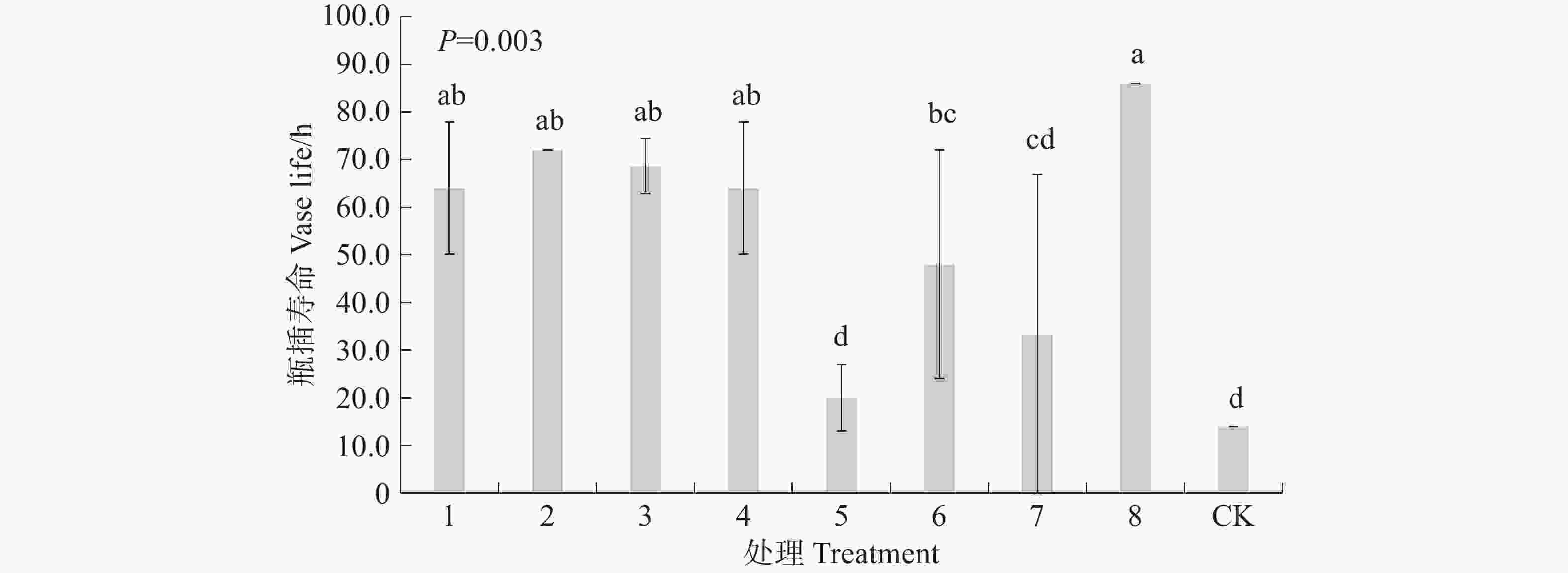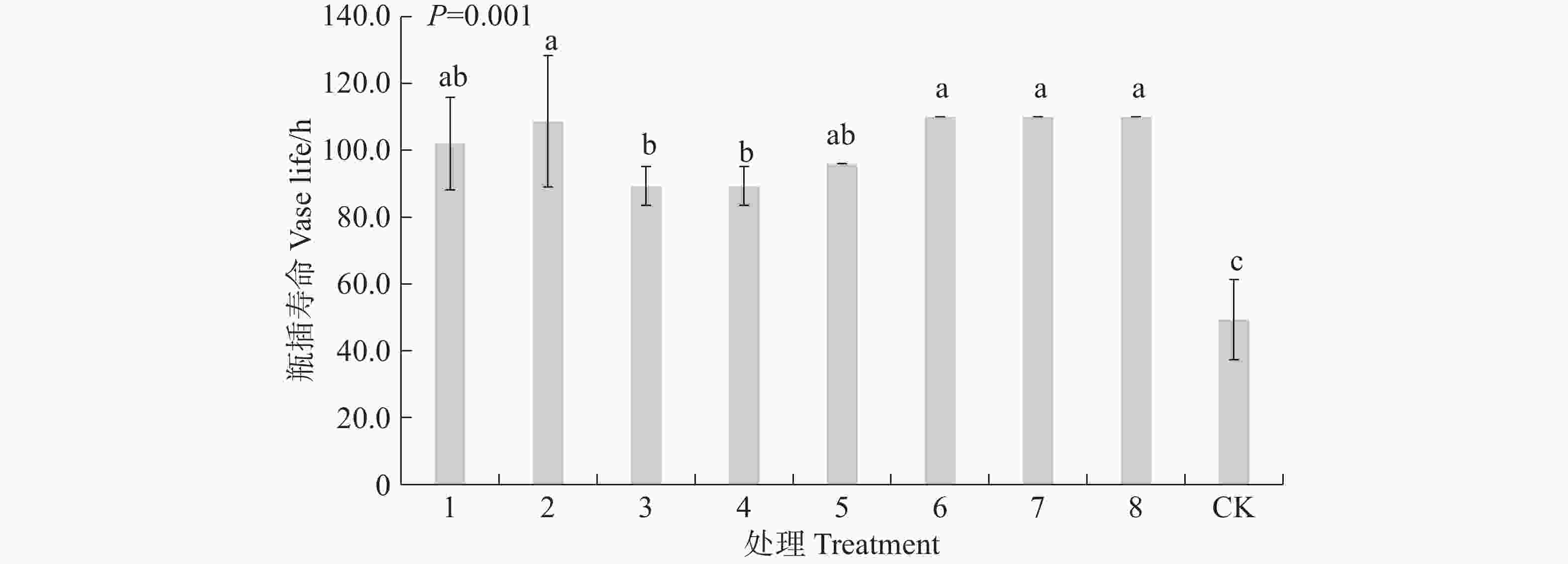 图 8 保鲜剂对露红期紫玉兰花朵瓶插寿命的影响