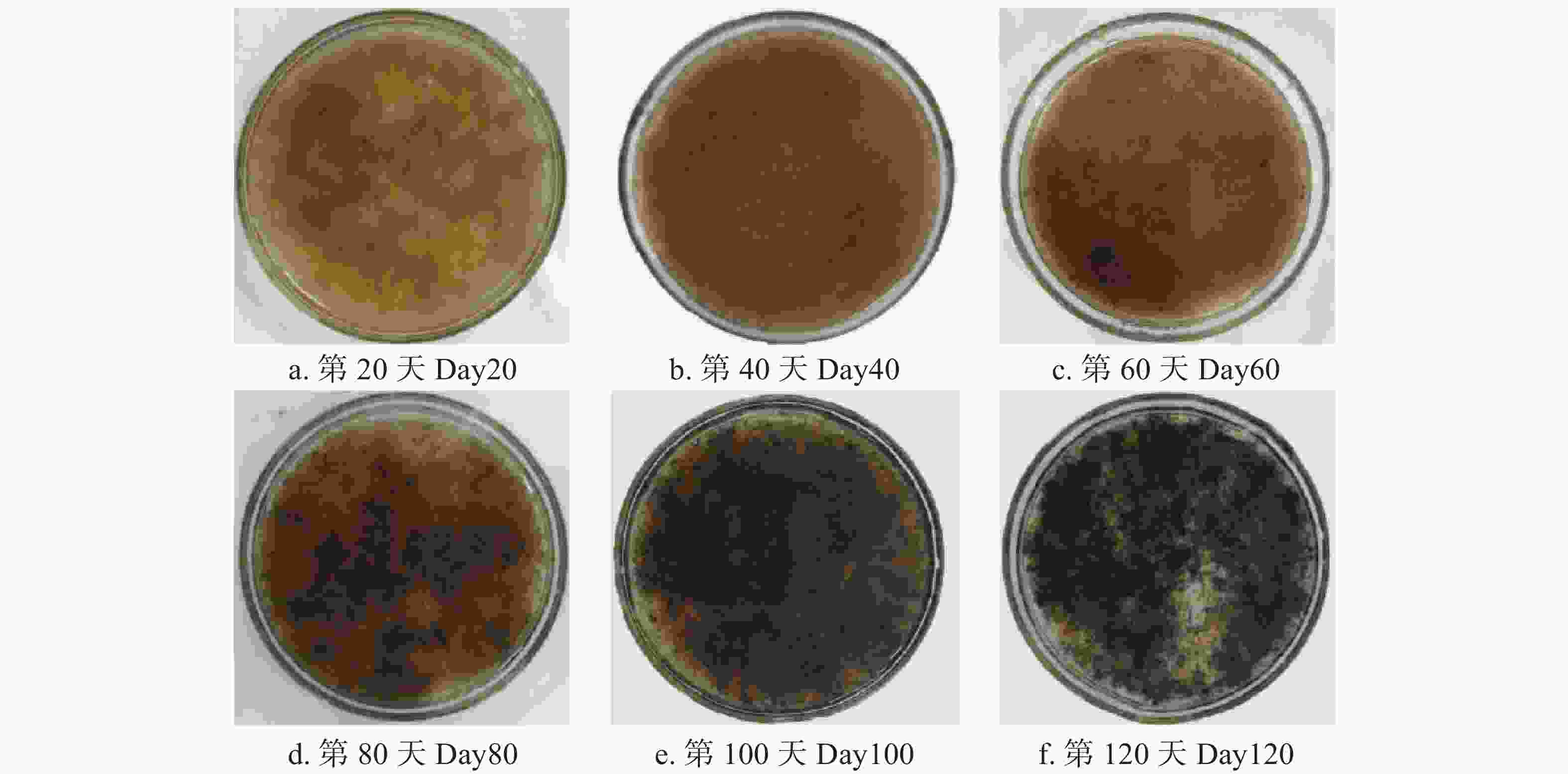 系统控制DO为0.5~0.8 mg·L−1,保持进水NH4+-N浓度不变,通过调节进水的葡萄糖投加量,控制C/N分别为4、6和11,每种条件下运行40 d,共连续运行120 d,污泥外观的变化见图2。试验初期,微膨胀活性污泥为土黄色,其结构较为松散,随着运行的持续进行,系统中出现了黑色菌丝团,并且其数量和体积在不断增加,这些菌丝体直径从5 mm左右逐渐增加至15 mm左右,这也标志着微膨胀污泥工艺成功启动。