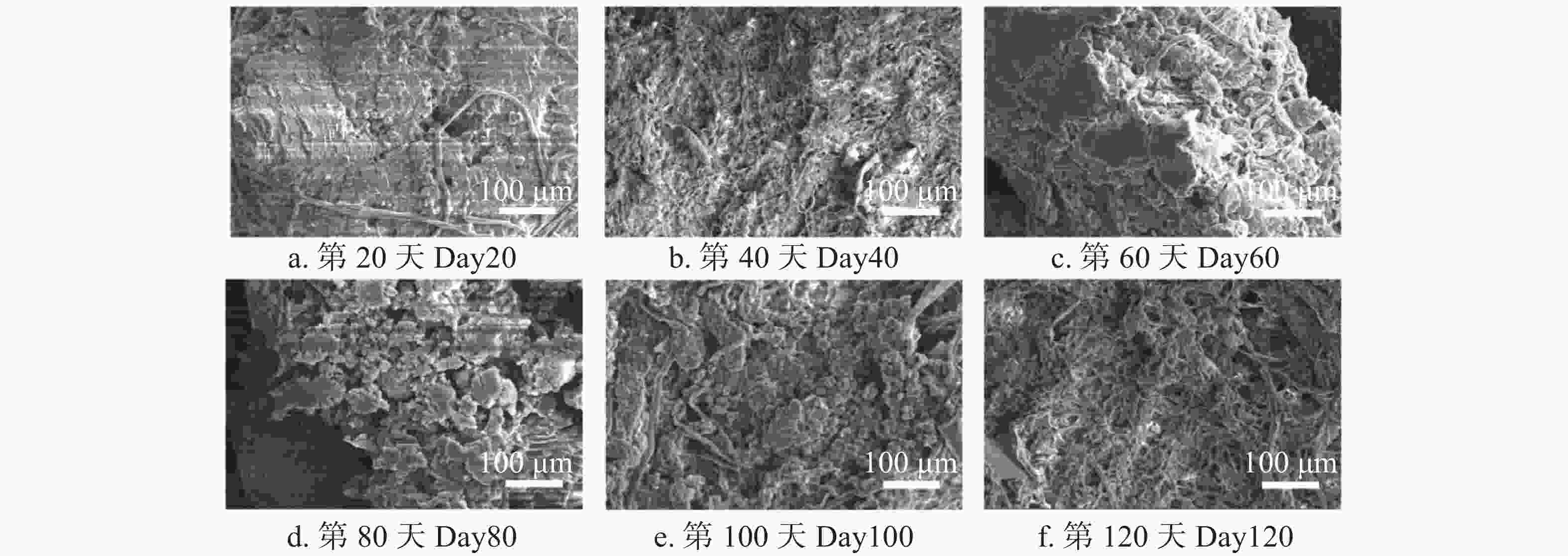 对污泥样品进行镜检,分析污泥膨胀发生期和恢复期污泥絮体及优势丝状菌的变化,结果见图3。在扫描电镜下,污泥絮体的粒径为50~500 μm。由图3-a可知菌丝团表面较为粗糙,在培养20 d后只有较少的菌丝;由图3-b可知,丝状菌缠绕在污泥颗粒表面;在第60天和第80天,可以观察到表面球状细菌和杆状细菌堆积。通过调节进水C/N,污泥膨胀得到控制,如图3-f所示,菌丝生长情况良好且均匀分布。
