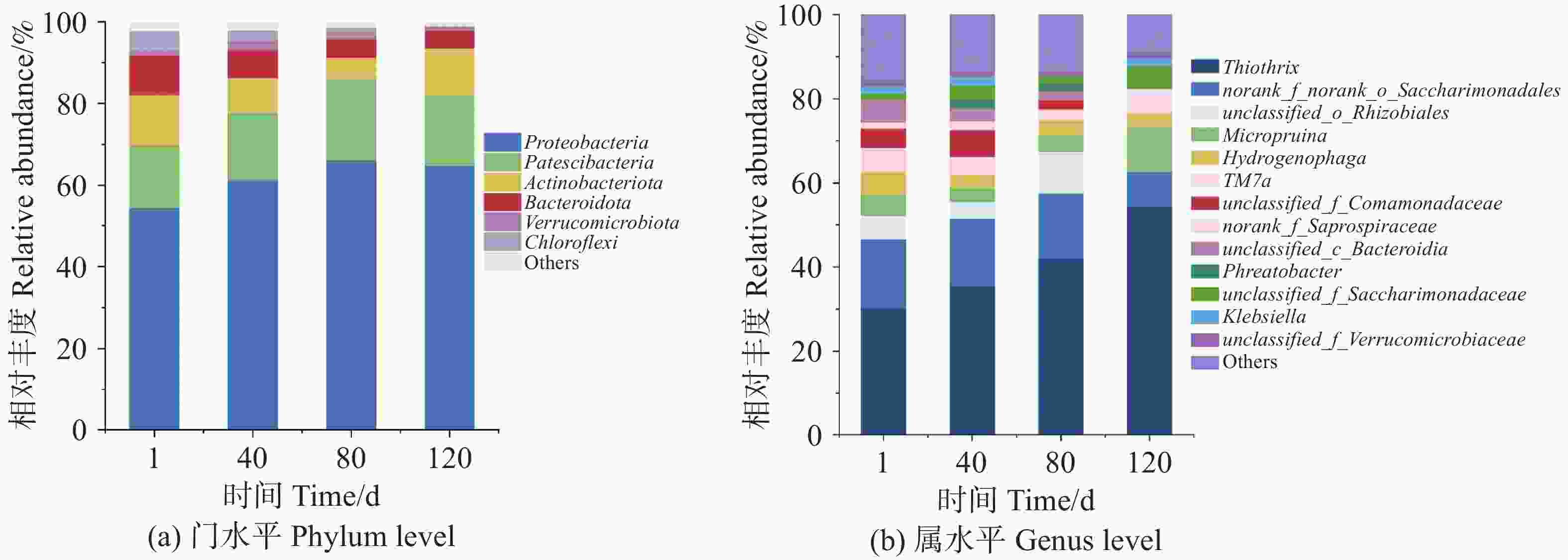 结合镜检分析,在C/N为4时,活性污泥表现出分散生长的趋势,随着C/N的增大,活性污泥的表面变得更疏松,可能是形成了更丰富的生物群落或者丝状菌的生长占据主导使得污泥膨大。系统运行的前40 d为污泥膨胀初期,40~80 d为污泥膨胀发生期,80~120 d为污泥恢复期。为了进一步揭示C/N对微膨胀活性污泥的影响,分析了不同时期微生物群落的变化,结果如图4所示。在门水平上,不同时期微膨胀活性污泥的群落组成存在一定差异,但是变形菌门(Proteobacteria)、髌骨细菌门(Patescibacteria)、放线菌门(Actinobacteriota)是各个时期共同的主要门类。Actinobacteria是参与脱氮除磷和分解有机物的主要微生物[8]。Proteobacteria也有脱氮除磷功能,该菌普遍存在于各类污水处理厂[9]。