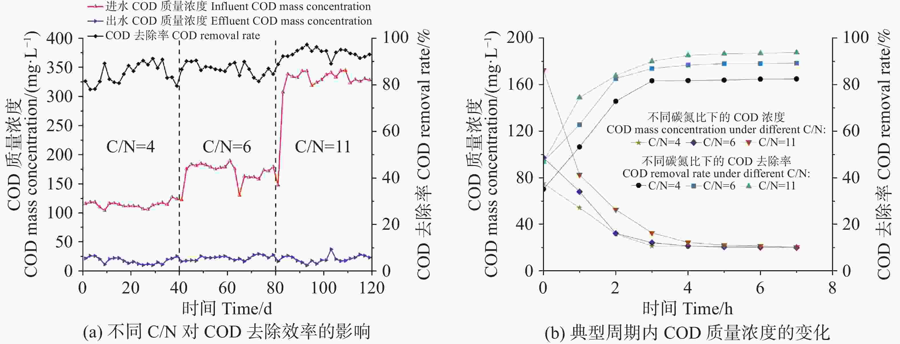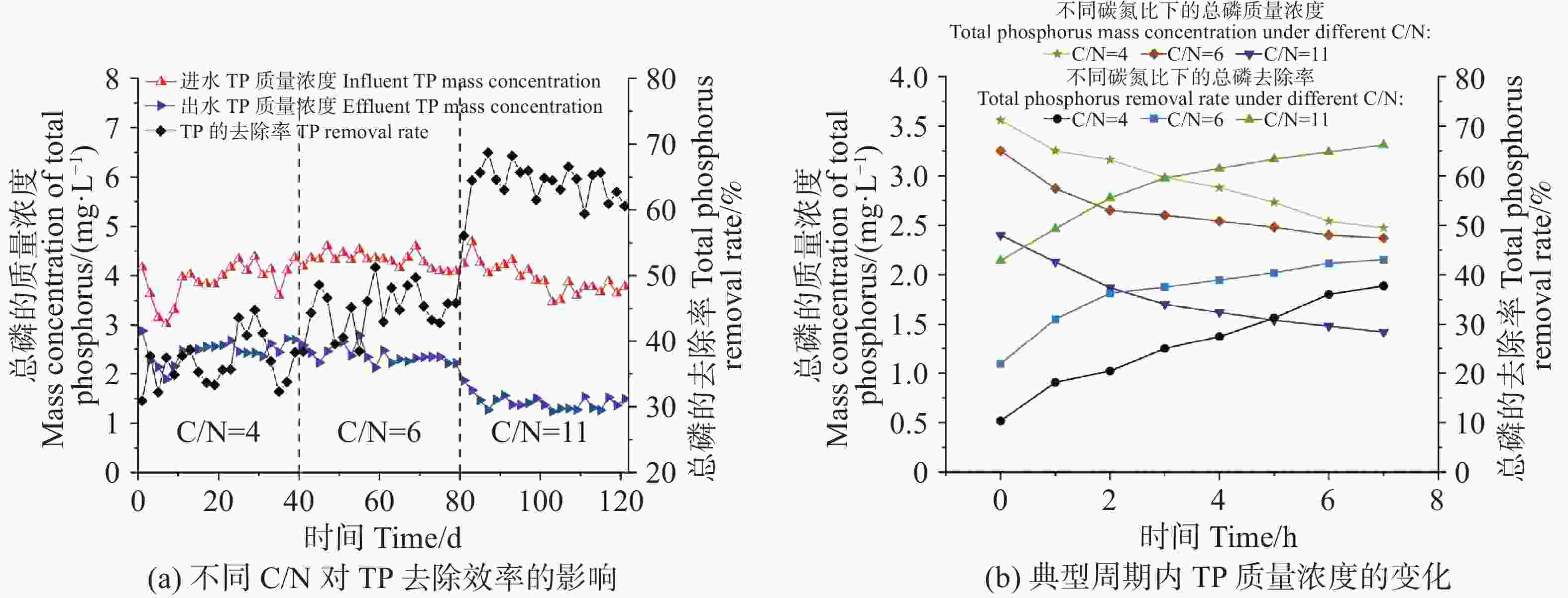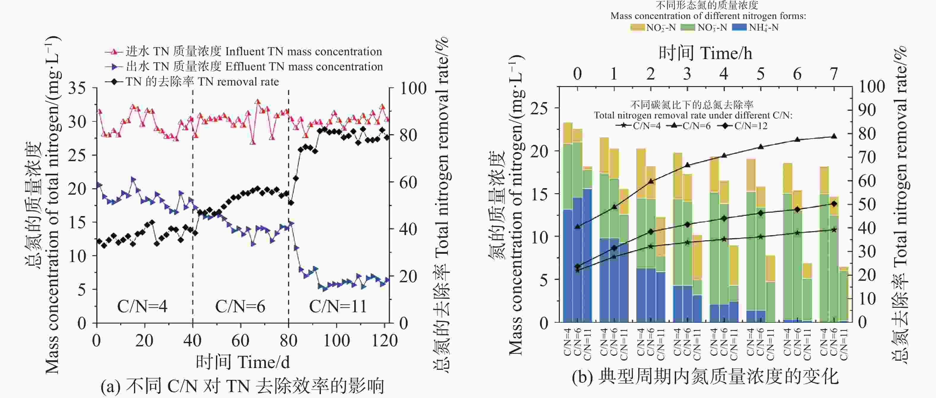 不同进水C/N条件下,系统对TN的去除效果如图7-a所示。由于系统一直控制在低DO环境下,DO在传递和扩散过程中质量浓度逐渐降低,在污泥絮体内部形成了缺氧环境,这为进行同步硝化反硝化创造了条件[14]。随着C/N的增加,TN去除率提高。3个阶段的总氮去除率变化趋势基本相同,脱氮能力逐渐增强。进水总氮平均质量浓度在30 mg·L−1左右,C/N为11时出水总氮质量浓度为6.59 mg·L−1。