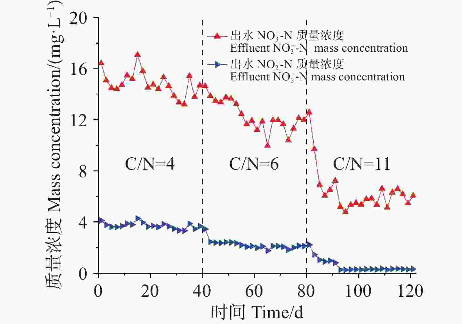 不同进水C/N条件下,系统出水NO3−-N、NO2−-N浓度如图6所示。当C/N为4时,出水NO3−-N和NO2−-N平均质量浓度分别为14.81和3.69 mg·L−1;当C/N为6时,出水NO3−-N和NO2−-N平均质量浓度分别为12.21 和2.15 mg·L−1;当C/N为11时,出水NO3−-N和NO2−-N平均质量浓度分别为6.11和0.48 mg·L−1。亚硝化细菌(AOB)和硝化细菌(NOB)的氧饱和常数分别为0.2~0.4、1.2~1.5 mg·L−1 [13],当控制反应器内溶解氧为0.5~0.8 mg·L−1时,根据Monod方程,NOB的比增长速率小于AOB。
