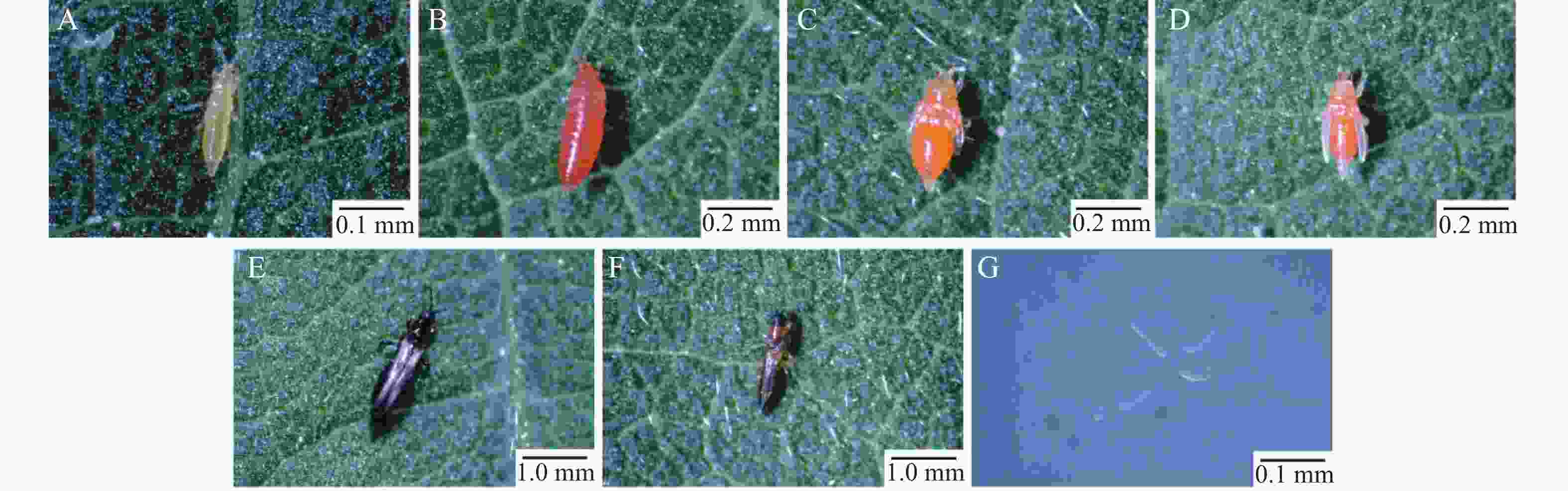 • M. usitatus is a hemimetabolous insect, progressing through five developmental stages: egg, first-instar nymph, second-instar nymph, prepupa, pseudopupa, and adult (Fig. 2). The first-instar nymph measures approximately 0.5 mm in length, with a white or pale-yellow body and red punctate compound eyes (Fig. 2-A). The second-instar nymph is approximately 1 mm long, exhibiting an orange-red body and incompletely developed red punctate compound eyes (Fig. 2-B). The prepupa (1 mm in length) displays an orange-yellow body, gradually maturing compound eyes, and short, translucent white wing buds on the dorsum, with stubby, translucent antennae (Fig. 2-C). During the pseudopupal stage (1 mm in length), the orange-yellow body is close to adult morphology, featuring enlarged dorsal wing buds and antennae extending posteriorly (Fig. 2-D). Adult females (1–2 mm) are generally larger than males. Both sexes exhibit dark brown pigmentation along the anterior and posterior margins of the fringed wings and at the abdominal terminus, with creamy-white coloration elsewhere. Females possess a dark brown body, while males display a dark brown head and abdominal transverse bands, with the remaining body regions dark yellow (Fig. 2-EF). Eggs are minute (0.1–0.2 mm), translucent, and white (Fig. 2-G).