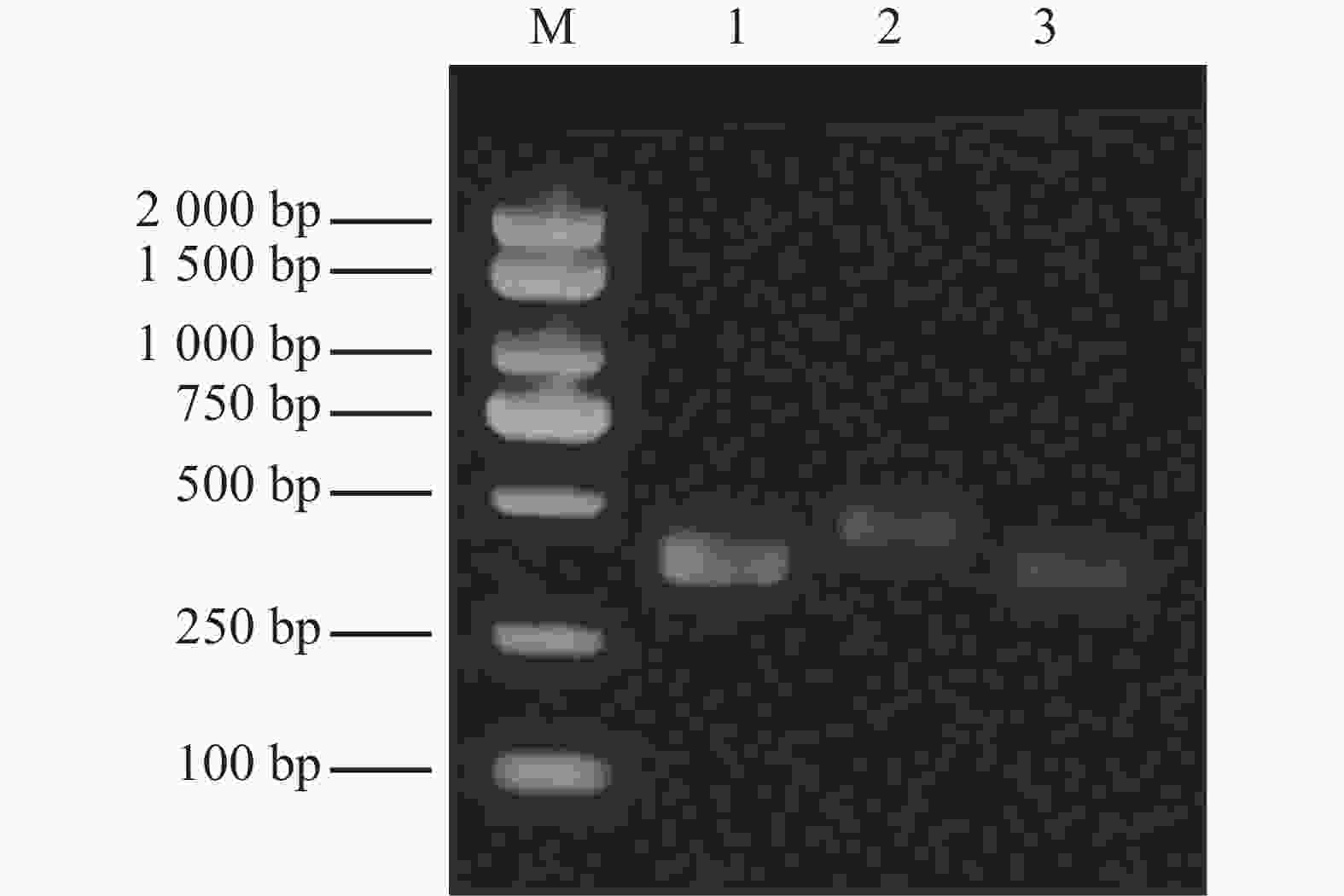 Figure 3.  Electrophoresis results for dsRNA detection M: Marker; 1: dsEGFP; 2: dsRh-1; 3: dsRh-2.