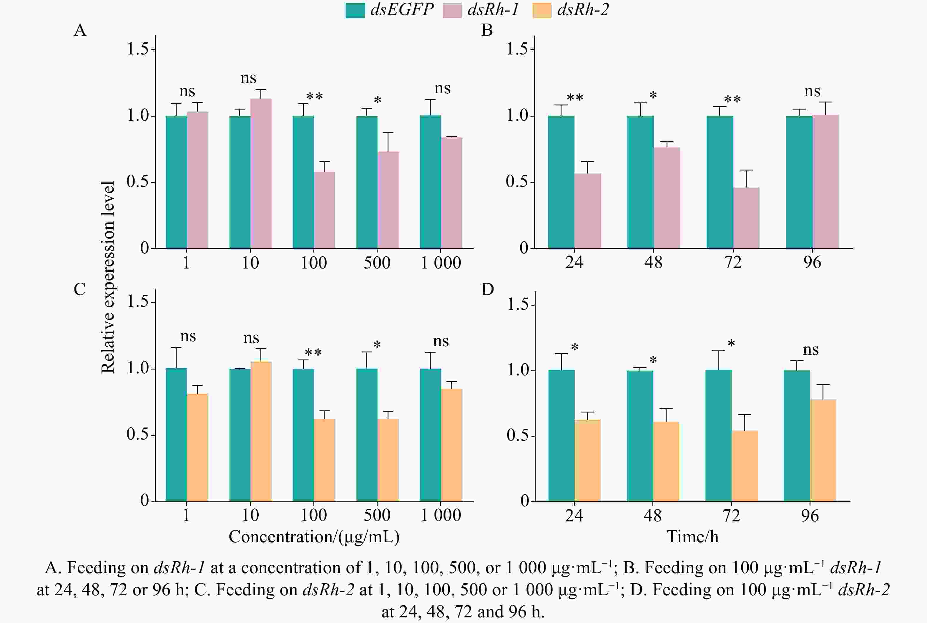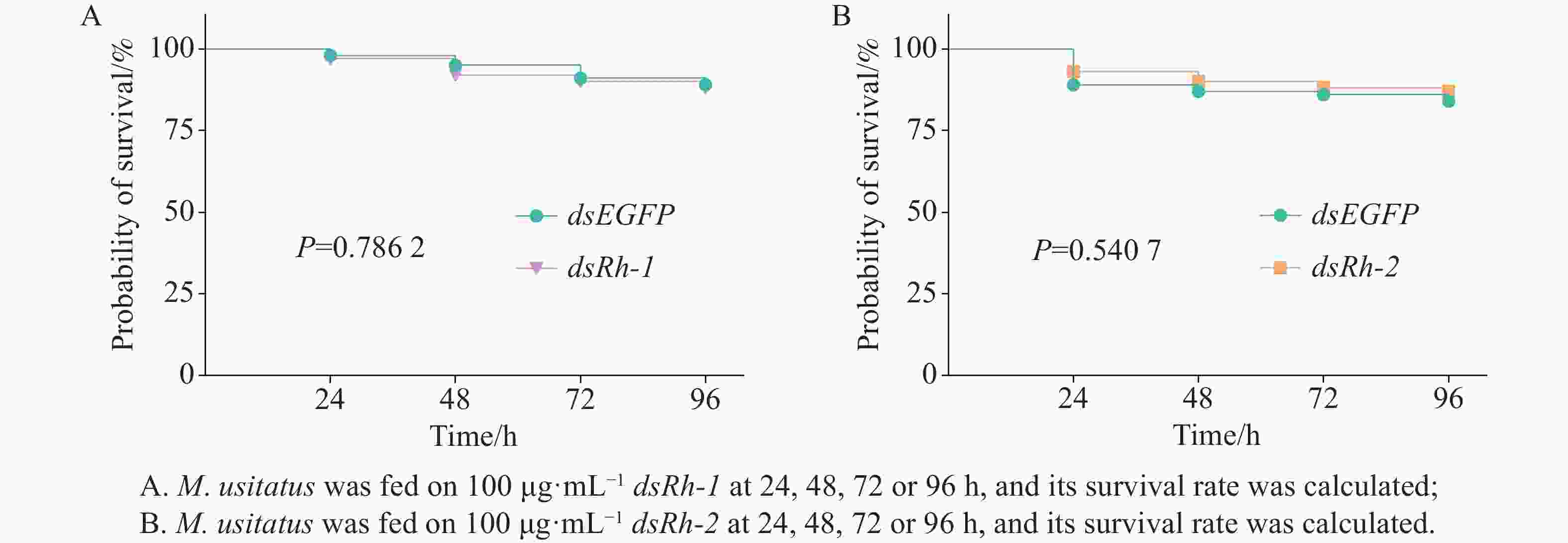 • No significant differences in survival rates (P = 0.7862) were observed among M. usitatus adults treated with dsEGFP or dsRh-1 at a concentration of 100 μg·mL−1 for 24, 48, 72, or 96 h (Fig. 5-A). Similarly, survival rates showed no significant difference (P = 0.5407) between groups fed on dsEGFP and dsRh-2 at a concentration of 100 μg·mL−1 over the same treatment duration (Fig. 5-B).