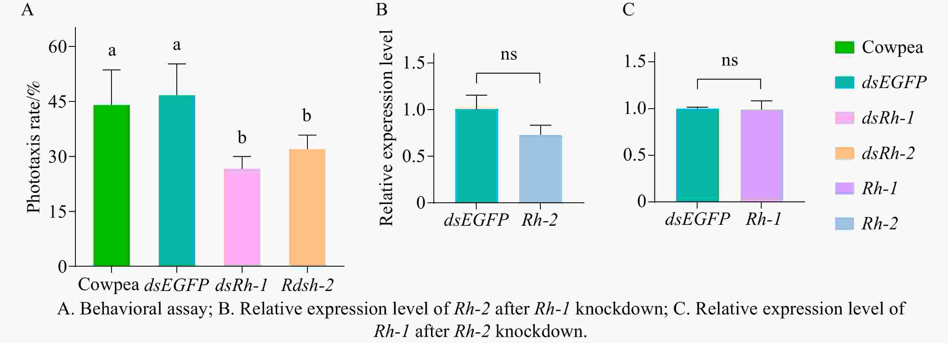 After feeding M. usitatus on dsEGFP and dsRh-1 at 100 μg·mL−1 for 72 h (resulting in Rh-1 knockdown), qRT-PCR analysis revealed no significant difference in the relative expression level of the other opsin gene Rh-2 compared to the control group (P > 0.05, Fig. 6-B). Using the same method, feeding on dsRh-2 at 100 μg·mL−1 (achieving Rh-2 knockdown) similarly showed no significant difference in Rh-1 expression as against the controls (P > 0.05, Fig. 6-C).