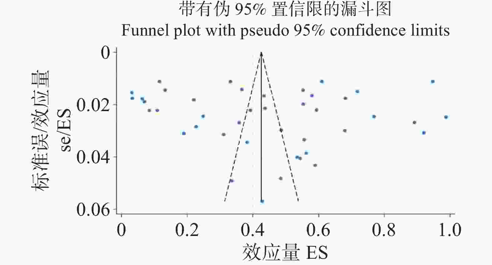 根据研究范围、发表时间、样本尺度、检测方法、年龄组等分层因素对感染率进行亚组分析,各组间异质性较大,采用随机效应模型。亚组分析结果显示:县域地区的感染率(53.5%,95% CI:41.7~65.1)显著高于城市地区(39.5%,95% CI:30.4~49.0);2000年以前发表的调查数据显示人群感染率高达71.0%(95% CI:48.6~89.0),而2011年后发表的数据显示感染率已降至21.7%(95% CI:14.8~29.5);碘液直接涂片法检出人群的感染率最高(61.8%,95% CI:48.3~74.5),显著高于透明胶纸法(34.9%,95% CI:23.6~47.2)和Kato-Katz法(41.7%,95% CI:24.8~59.7);15岁以下人群的感染率(47.5%,95% CI:33.7~61.4)高于全年龄段人群(42.8%,95% CI:26.2~60.4)和3岁以上人群(30.6%,95% CI:21.1~40.9),详见表5。