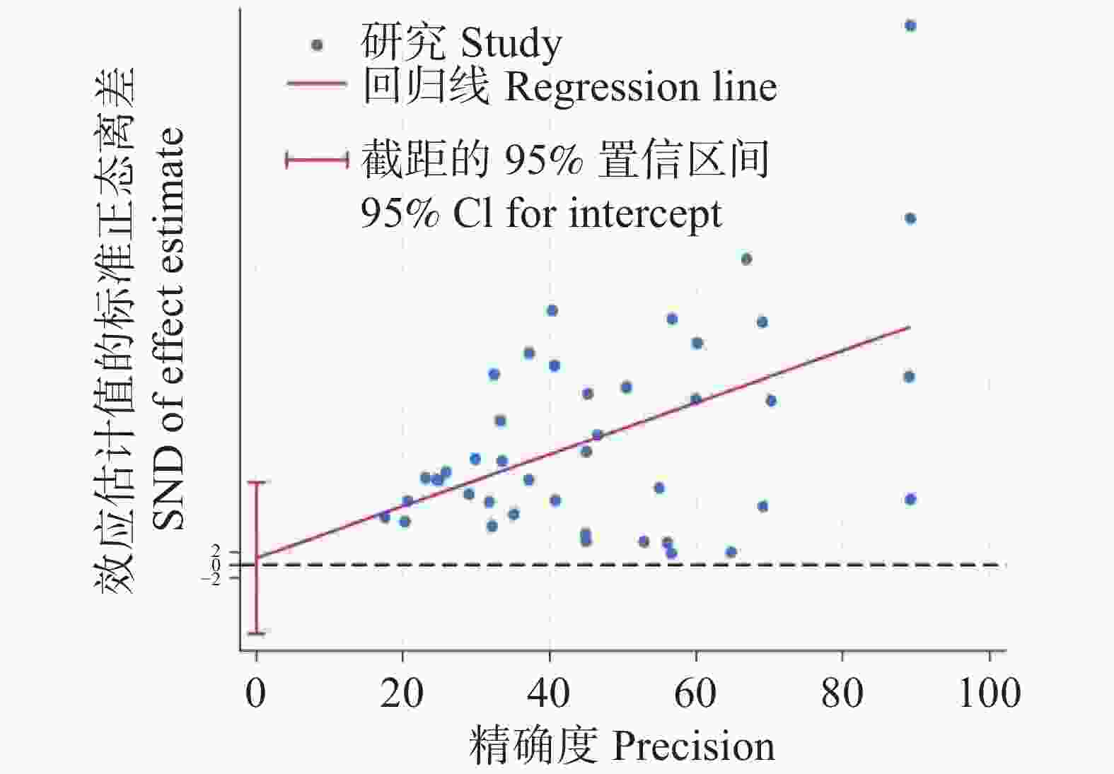 本研究系统检索了建库后至2025年4月期间发表的关于海南省肠道寄生虫感染的流行病学调查文献,在中英文数据库中初步检索共获得201篇文献,查重后排除文献61篇,通过独立筛选文献、提取资料并交叉核对后一致认为,有42篇符合标准的研究可以纳入分析[8 − 49],其中,中文文献42篇,英文文献0篇。纳入文献基本情况及偏移风险评价见表1。异质性检验显示研究间存在高度异质性(I2=99.916%,P<0.001),表明筛选的文献存在明显异质性,故采用随机效应模型进行meta分析(图1)。漏斗图分析(图2)显示散点分布基本对称。采用Egger's检验(图3)评估发表偏倚,结果显示,截距为1.106(t=0.19,P=0.851),95% CI为10.73~12.94,提示纳入研究不存在显著发表偏倚。