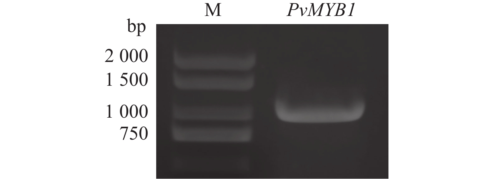 • 利用Expasy(https://web.expasy.org/)对PvMYB1进行蛋白理化性质分析,在NCBI(https://www.ncbi.nlm.nih.gov/cdd/)中对蛋白保守结构域进行分析;借助 SignalP 5.0在线分析平台(https://novopro.cn/tools/signalp),完成PvMYB1蛋白信号肽预测,通过WoLF PSORT(https://wolfpsort.hgc.jp/)预测亚细胞定位;采用MEGA 11软件构建蛋白进化树。