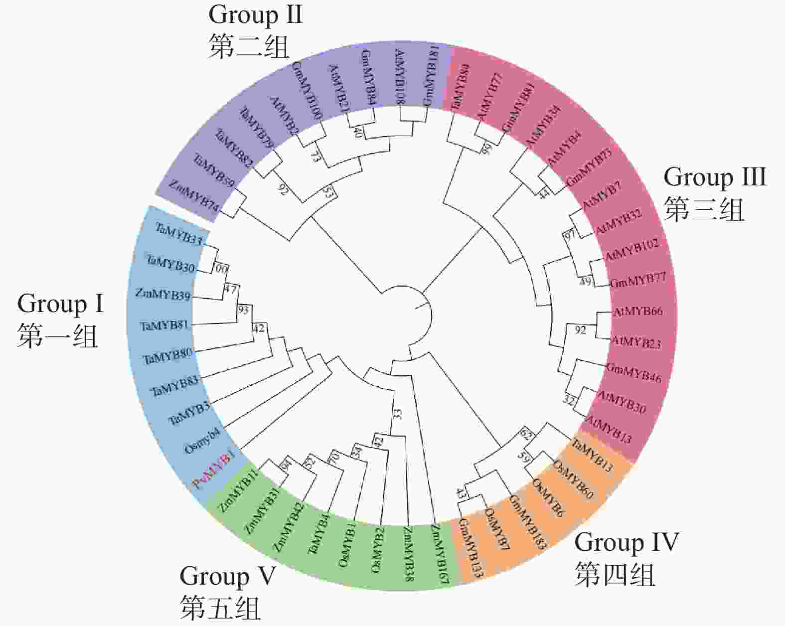 • 为分析PvMYB1蛋白与不同物种MYB蛋白的关系,本研究将PvMYB1与水稻、玉米、大豆、小麦、拟南芥等MYB蛋白构建进化树。基于图5系统发育分析,多种植物MYB蛋白聚类为5组。PvMYB1与水稻OsMYB4同源性较高,被分在第一组中。表明PvMYB1可能具有与OsMYB4相似的增加植物对干旱胁迫的生理生化适应性的功能。
