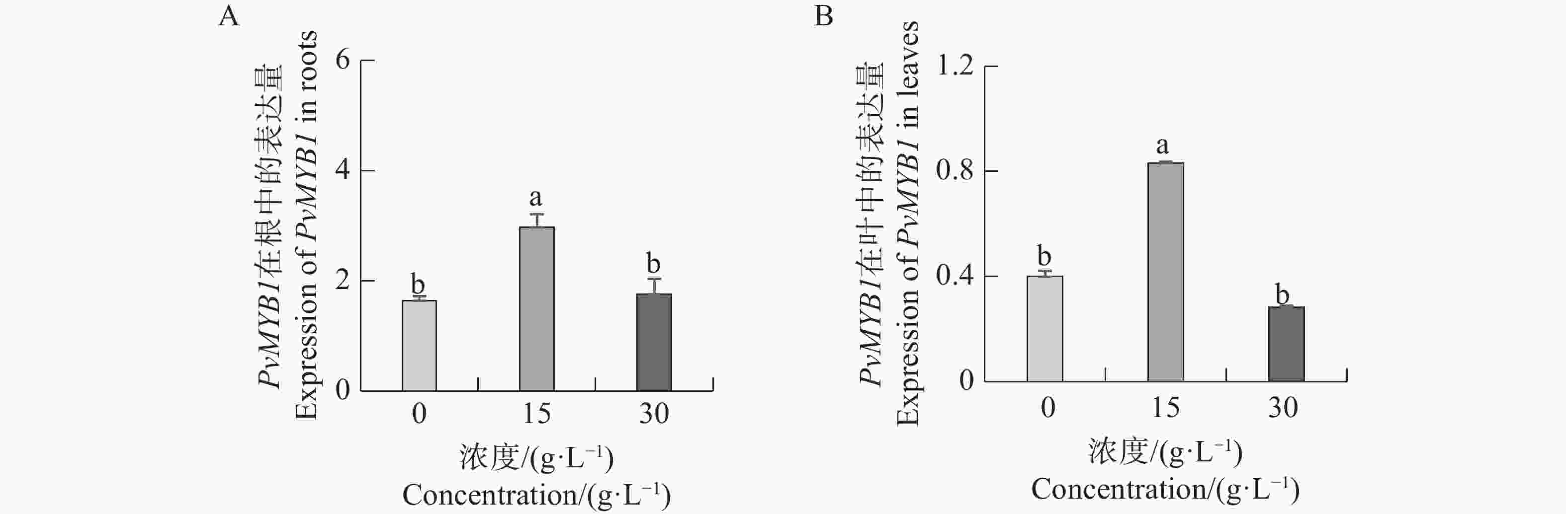• 图7显示,PvMYB1基因在NaCl浓度升至15 g·L−1时,在根和叶中的表达量显著上调。然而,随着NaCl浓度进一步增至30 g·L−1,表达量又显著下降。15 g·L−1盐处理条件下PvMYB1基因在根和叶中的表达量与对照和30 g·L−1盐处理组之间差异达显著水平。PvMYB1对盐胁迫呈先升后降的表达模式,其可能在15 g·L−1 NaCl范围内发挥早期应答作用。