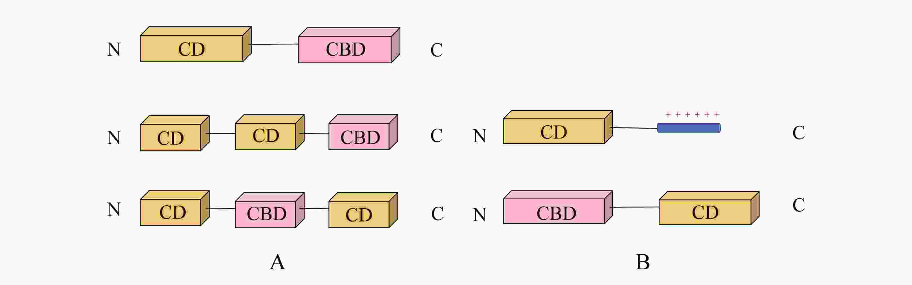 根据细菌细胞壁的结构特点,可将细菌分为具有独特外膜结构的革兰氏阴性菌和无外膜结构的革兰氏阳性菌两大类。革兰氏阳性菌细胞壁由内膜和肽聚糖层两部分组成,而革兰氏阴性菌的细胞壁由三部分组成,从外到内分别是外膜、肽聚糖层和内膜,外膜是不对称的双分子层,由外小叶的脂多糖、外膜蛋白和内小叶的磷脂组成[25]。针对革兰氏阴性和革兰氏阳性细菌的噬菌体裂解酶的结构和作用机制因二者细胞壁结构的差异而有所不同(图1)。针对革兰氏阳性菌的噬菌体裂解酶通常具有模块化结构,由保守的催化结构域(Catalytic Domain, CD)和细胞壁结合结构域(Cell Wall Binding Domain, CBD)组成,二者通过可变长度的短肽连接序列(Linker)连接(图1—A)。CBD与细菌细胞壁上的受体特异性结合,促进CD锚定裂解肽聚糖中的化学键,共同导致细菌细胞壁的裂解[26]。革兰氏阳性菌噬菌体裂解酶通常由一个或多个CD和一个CBD组成,例如金黄色葡萄球菌裂解酶LysP4具有高效的裂解活性,由N端的半胱氨酸—组氨酸依赖性酰胺水解酶/肽酶(cysteine-histidine-dependent amidohydrolases/peptidases, CHAP)、中心的酰胺酶(Amidase-2)两个催化结构域,和一个C端SH3b结合结构域组成[27]。分枝杆菌噬菌体裂解酶LysinA由两个CD和一个CBD组成,无乳链球菌噬菌体裂解酶λSA2的结构由两端的CD和1个中间的CBD组成[28 − 29]。而后续的研究也发现了含有多个CBD的噬菌体裂解酶,例如,链球菌裂解酶 Ply1228 有两个 CD 和两个 CW-7 CBD[30]。靶向引起人兽共患病的绿色气球菌的噬菌体裂解酶AVPL由一个N端N-乙酰壁酰基-L-丙氨酸酰胺酶催化结构域和C端两个LysM 结合结构域组成[31]。革兰氏阴性菌噬菌体裂解酶通常呈现单结构域球状结构,由单个催化结构域组成,C末端通常带有正电荷(图1—B)[32]。革兰氏阴性菌外膜结构的存在导致外源裂解酶无法与细菌细胞壁直接结合,这也许可以解释革兰氏阴性菌裂解酶大多是不存在CBD的。但少部分的革兰氏阴性菌裂解酶也存在模块化结构,不同的是革兰氏阴性菌的CD一般位于C端,而CBD位于N端,与革兰氏阳性菌裂解酶结构域位置相反(图1—B)[33]。基于噬菌体裂解酶的模块化结构,可以对裂解酶的结构域进行理性设计,开发具有针对性的噬菌体裂解酶。