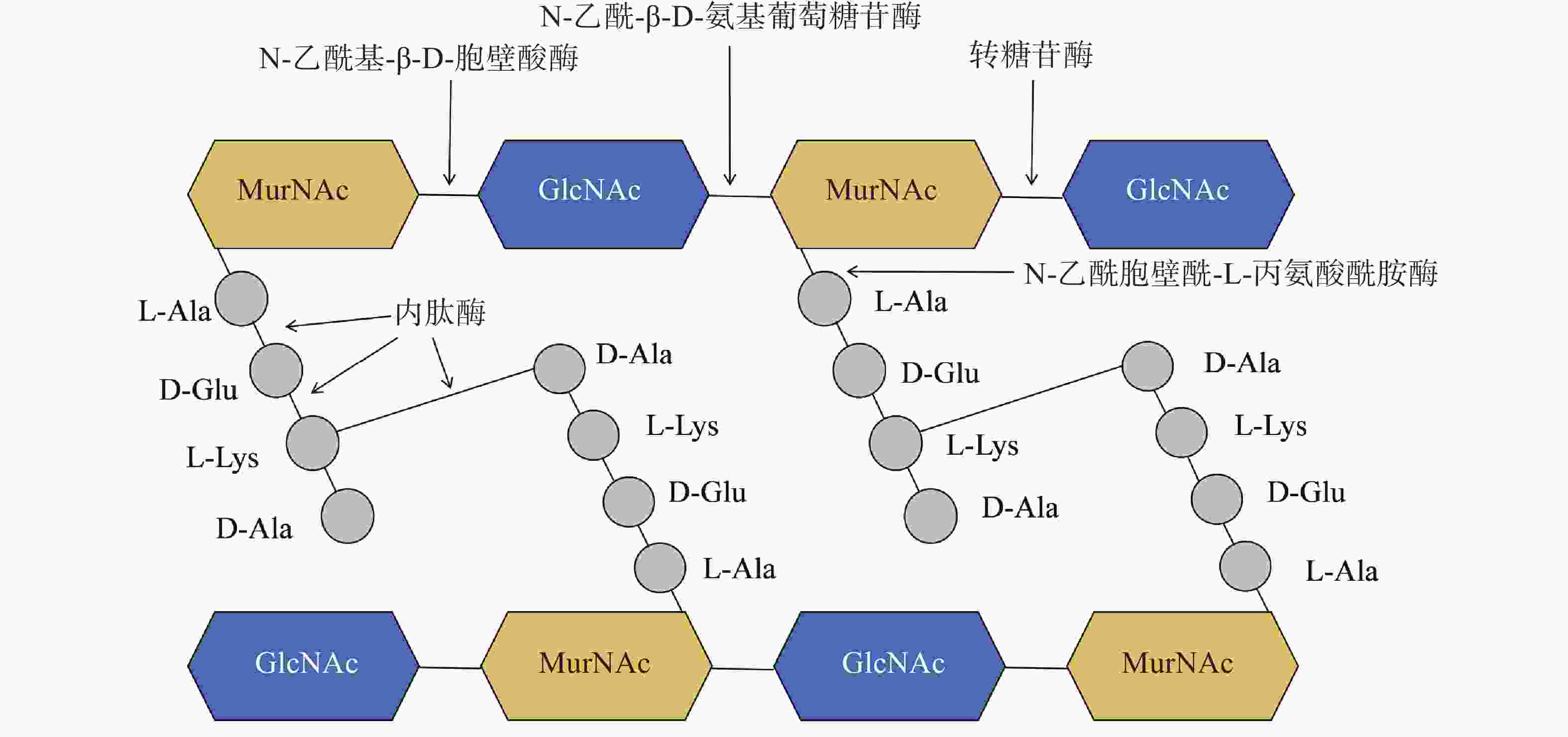 噬菌体裂解酶作为噬菌体侵染细菌后的产物,在宿主内合成后从内到外裂解细菌细胞壁。噬菌体通过吸附细菌完成复制周期后,在细菌内产生裂解酶与穿孔素(Holin),经典裂解机制是由穿孔素先插入到细菌的细胞质膜中,形成孔洞,帮助裂解酶到达肽聚糖层完成对肽聚糖的裂解[34 − 35]。肽聚糖层是细菌细胞壁的重要组成部分,它由双糖N-乙酰胞壁酸(N-acetylmuramic acid, MurNAc)与N-乙酰-D-葡萄糖胺(N-acetylglucosamine, GlcNAc)通过β-1,4-糖苷键连接形成的线性聚合物网络[36]。这些双糖单位通过短肽进一步交联形成了复杂的网状结构,赋予细胞壁机械强度并决定了细胞的固定形状,有助于维持细胞壁的完整性[37]。CD能够特异地识别并切断肽聚糖中的化学键,破坏肽聚糖骨架结构,促使细菌裂解死亡。根据CD在肽聚糖上的作用位点和功能差异,可以将噬菌体裂解酶分为不同的类型(图2):①N-乙酰基-β-D-胞壁酸酶:切割从N-乙酰胞壁酸到N-乙酰-D-葡萄糖胺之间的β-1,4糖苷键;②转糖苷酶:切割位置与N-乙酰-β-D-胞壁酰胺酶相同,但作用机制独特,这种反应不依赖水分子,它们通过催化邻近糖分子内的反应导致糖苷键的断裂,并通过转移糖基团形成新的糖苷键,从而改变肽聚糖多糖链的结构和连接方式;③N-乙酰-β-D-氨基葡萄糖苷酶:切割从N-乙酰-D-葡萄糖胺到N-乙酰胞壁酸的β-1,4糖苷键;④N-乙酰胞壁酰-L-丙氨酸酰胺酶:切割N-乙酰胞壁酸和L-丙氨酸之间的酰胺键[38];⑤内肽酶:切割肽侧链和肽桥上的肽键。不同细菌物种间肽聚糖的酰胺键和氨基糖苷之间的β-1,4-糖苷键往往是保守的,因此相比于其他几种裂解酶,酰胺酶具有更广泛的裂解谱[39]。