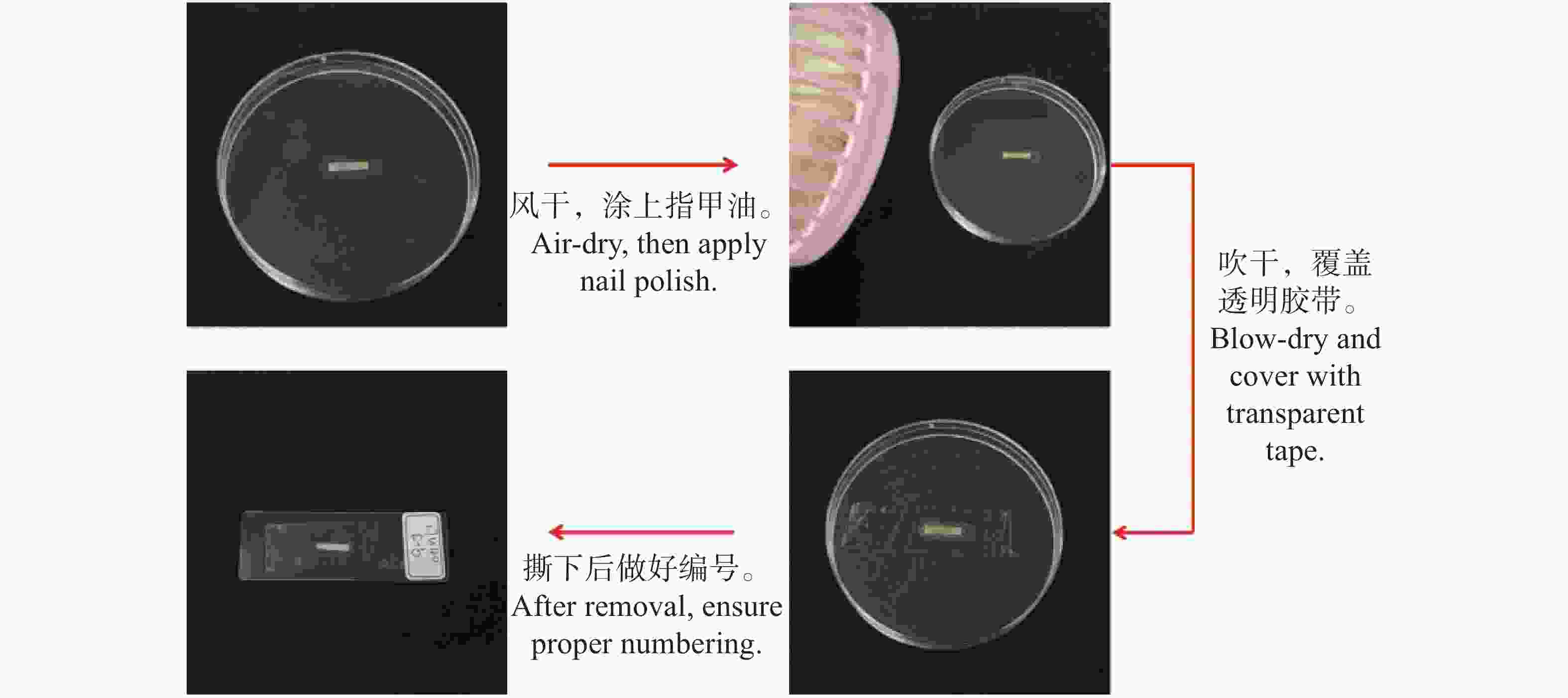 乳突是植物表皮细胞壁或角质层向外凸起形成的产物,在植物受到盐胁迫时可以将植物体内的Na+封存在叶乳突内。叶乳突临时装片的制作采用指甲油拓印法[18](图1),将叶片从FAA固定液里取出来后风干,取叶片的中部,之后涂薄薄的一层透明甲油在叶片的上表皮,再使用手持小风扇将其吹干并用高透的透明胶带覆盖在上表皮上,随后轻轻的按压使胶带和甲油胶更加的贴合慢慢的把胶带撕下粘贴在载玻片上写好相应的编号。将制作好的临时装片放在光学显微镜(Olym-pus BX41,Olympus,Tokyo,Japan)