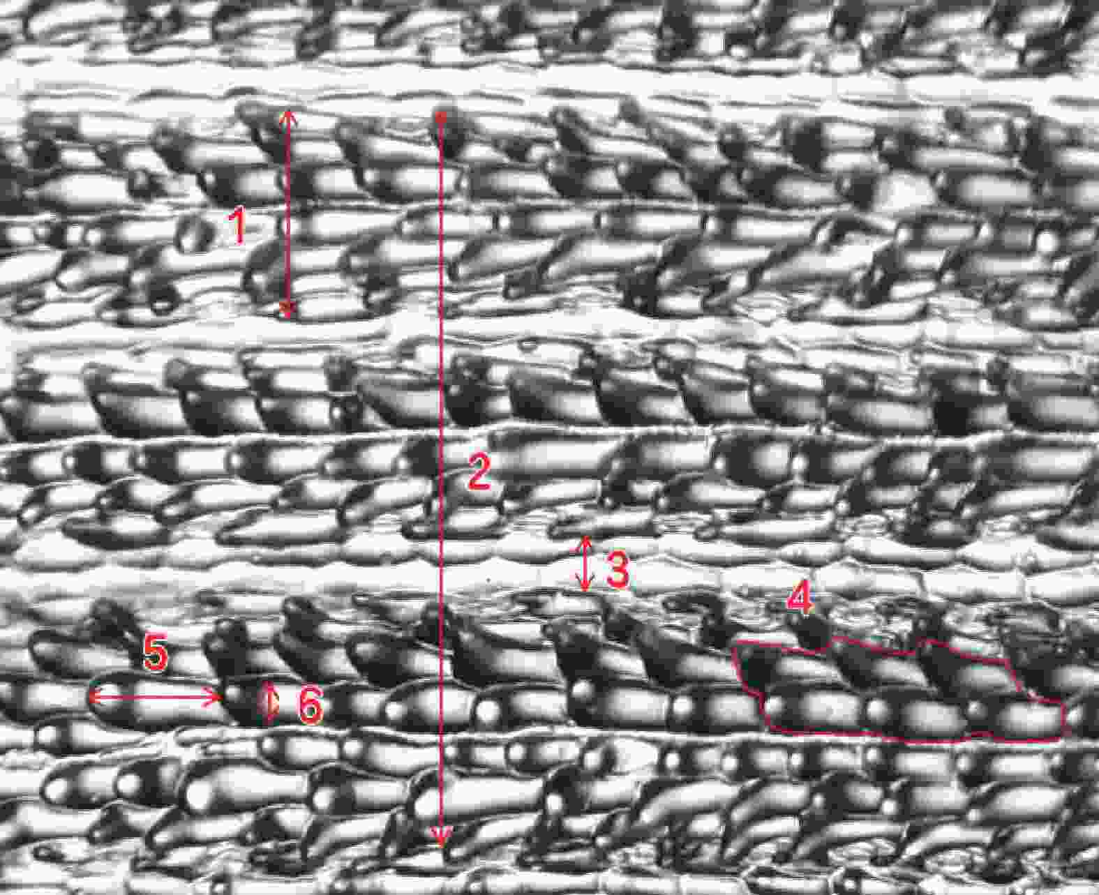 Note: 1 means the width of the leaf papilla cluster; 2 means the total width of the leaf papilla cluster; 3 means the width of the gaps between leaf papillae; 4 means the area of the leaf papilla; 5 means the length of a single leaf papilla; 6 means the width of a single leaf papilla.