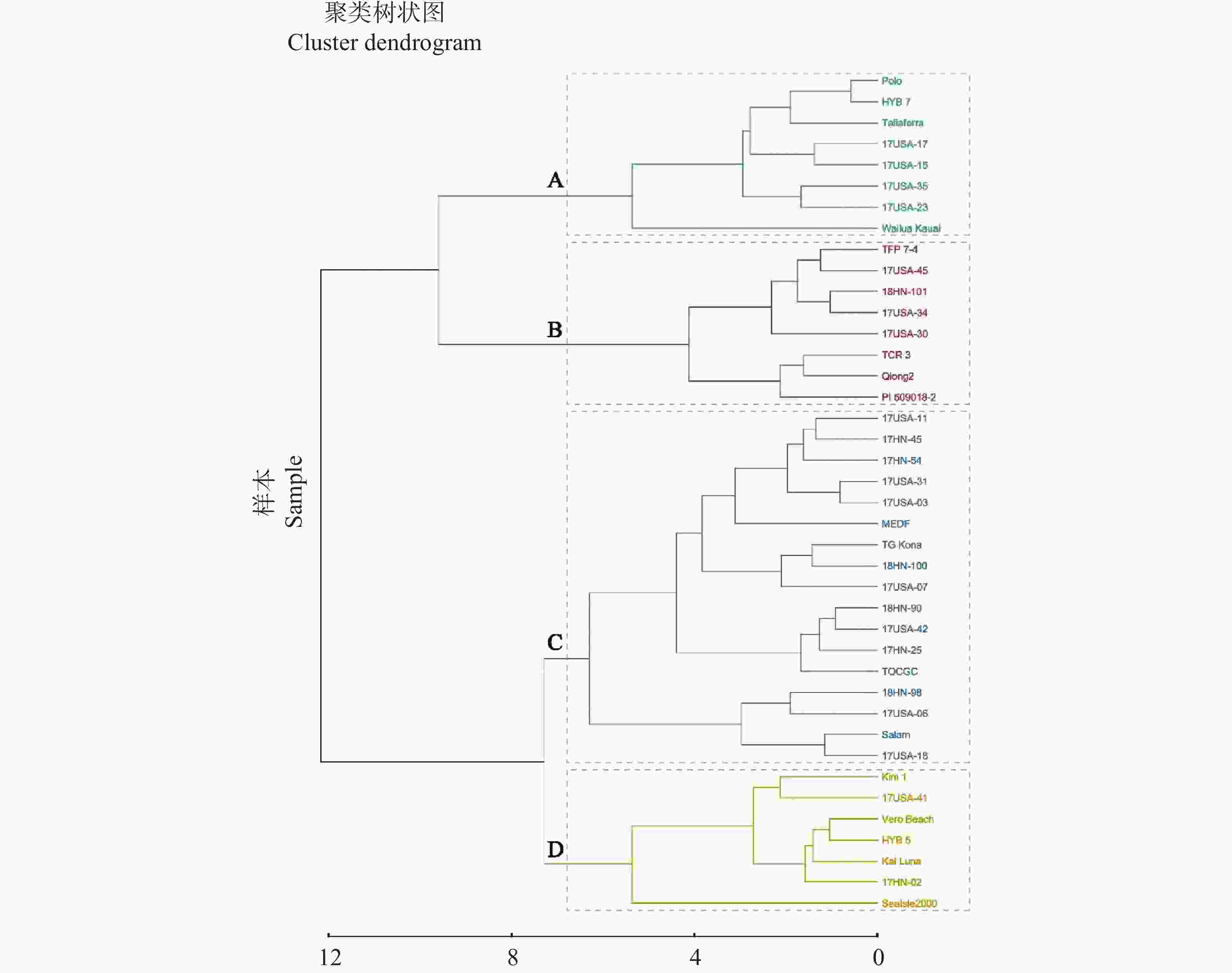 以40份供试材料为基础,按照叶乳突的各个指标进行聚类划分(图2),将其划分为4大类(A、B、C、D)。其中,A类包括Wailuakauai 、Taliaferra、17USA-17、17USA-15、17USA-23、17USA-35、HYB7、Polo等8个种质;B类包括TFP7-4、17USA-45、18HN-101、17USA-34、17USA-30、TCR3、琼2(qiong2)、PI509018-2等8个种质;C类包括17HN-45、17HN-54、17HN-25、17USA-11、17USA-31、17USA-03、17USA-07、17USA-06、17USA-42、17USA-18、18HN-100、18HN-90、18HN-98、马尔代夫(MEDF)、TGKona、TOCGC、Salam等17个种质;D类包括Kim1、17USA-41、VeroBeach、HYB5、17HN-02、Sealsle2000、KaiLuna等7个种质。