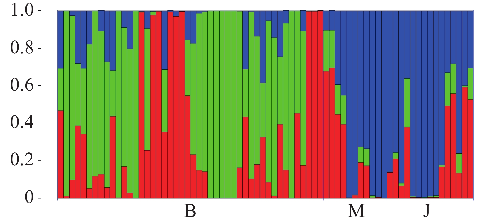 海南钻喙兰的Structure分析结果显示,delta K 在K = 3时取得最大值,故最优K值为3,即祖先种群由3种遗传成分组成。种群B的个体表现出较高程度的遗传混合,主要由绿色和红色成分组成,表明群体间存在较强的基因交流。种群M以红色成分为主,少量混入绿色和蓝色成分,显示其遗传结构相对独立但仍存在一定的基因流。相比之下,群体J几乎完全由蓝色成分构成,代表其具有独立的遗传背景,与其他群体间的基因交流较少。总体而言,这些结果表明研究群体间存在显著的遗传结构,其中群体J的遗传独立性最强。