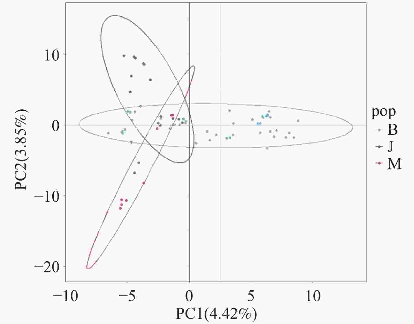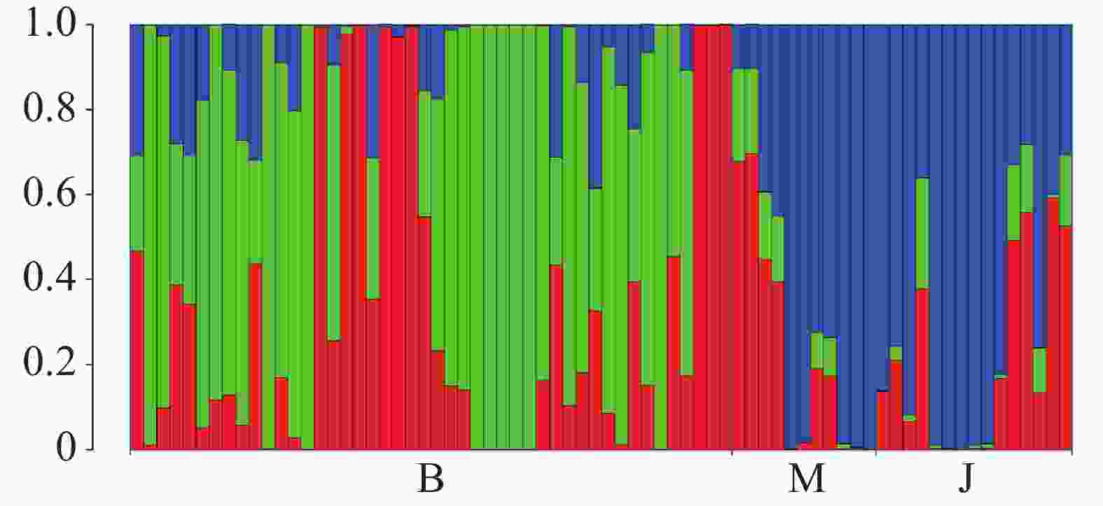 Pop N Pi Ho He Fis BWL 72 0.149 0.116 0.149 0.219 B 46 0.147 0.122 0.145 0.107 M 11 0.139 0.121 0.132 0.049 J 15 0.137 0.105 0.132 0.104 注:Pop.种群;BWL.霸王岭样地;B.B群;M.M群;J.J群;N.样本数量;Pi.核苷酸多样性;Ho.观察杂合度;He.期望杂合度;Fis.近交系数。多样性指标均基于最终筛选后的SNP位点计算。 Note: Pop. Population; BWL.Bawangling plot; B. Population B; M. Population M; J. Population J; N. Sample size; Pi. Nucleotide diversity; Ho. Observed heterozygosity; He. Expected heterozygosity; Fis. Inbreeding coefficient. All diversity indices were calculated based on the final set of filtered SNP loci. -