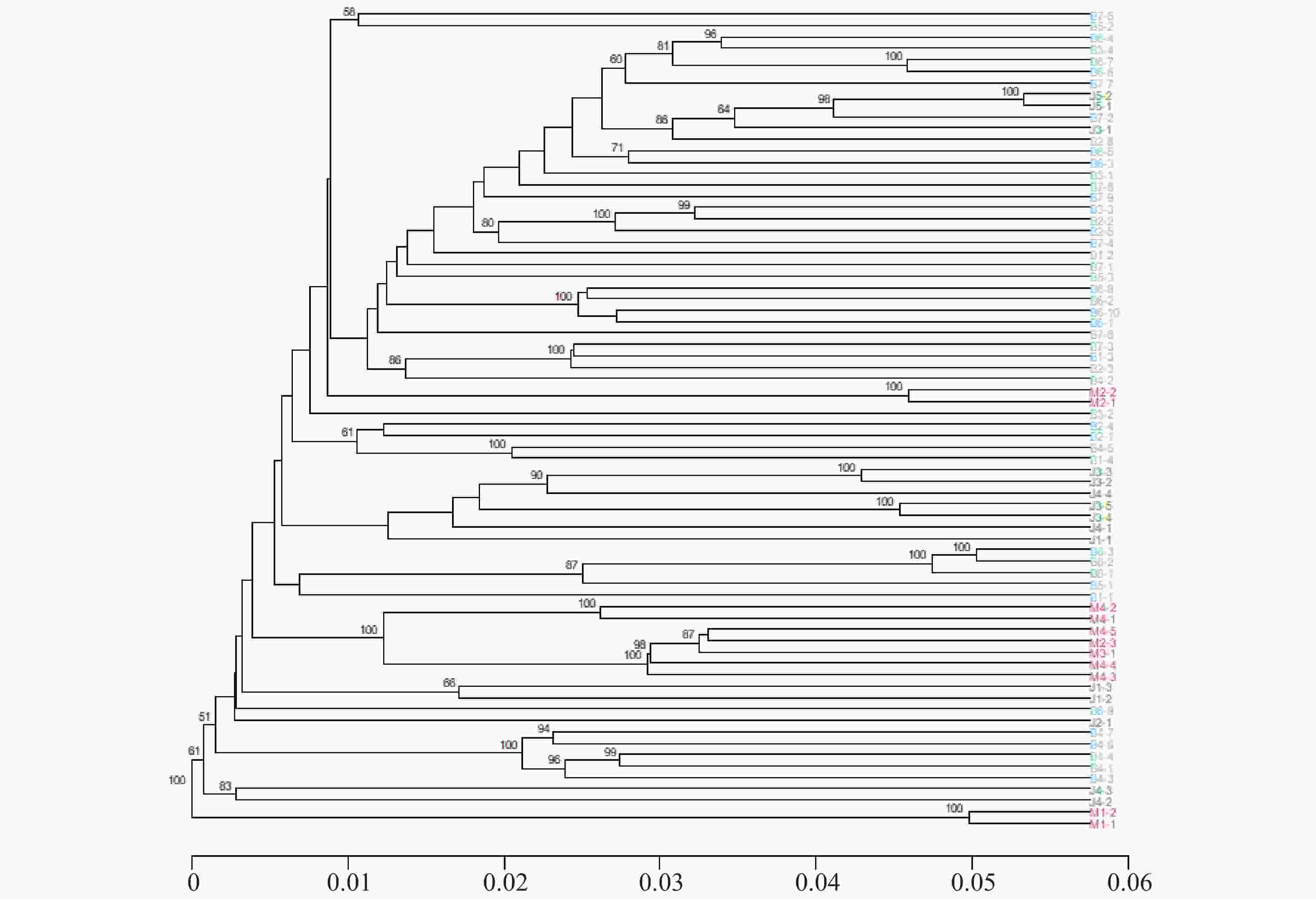 注:节点处数字表示自助法(bootstrap)支持率(%);不同颜色代表来自不同种群的个体;下方的刻度尺表示SNP遗传距离,用于量化不同个体或分支之间的遗传分化程度。