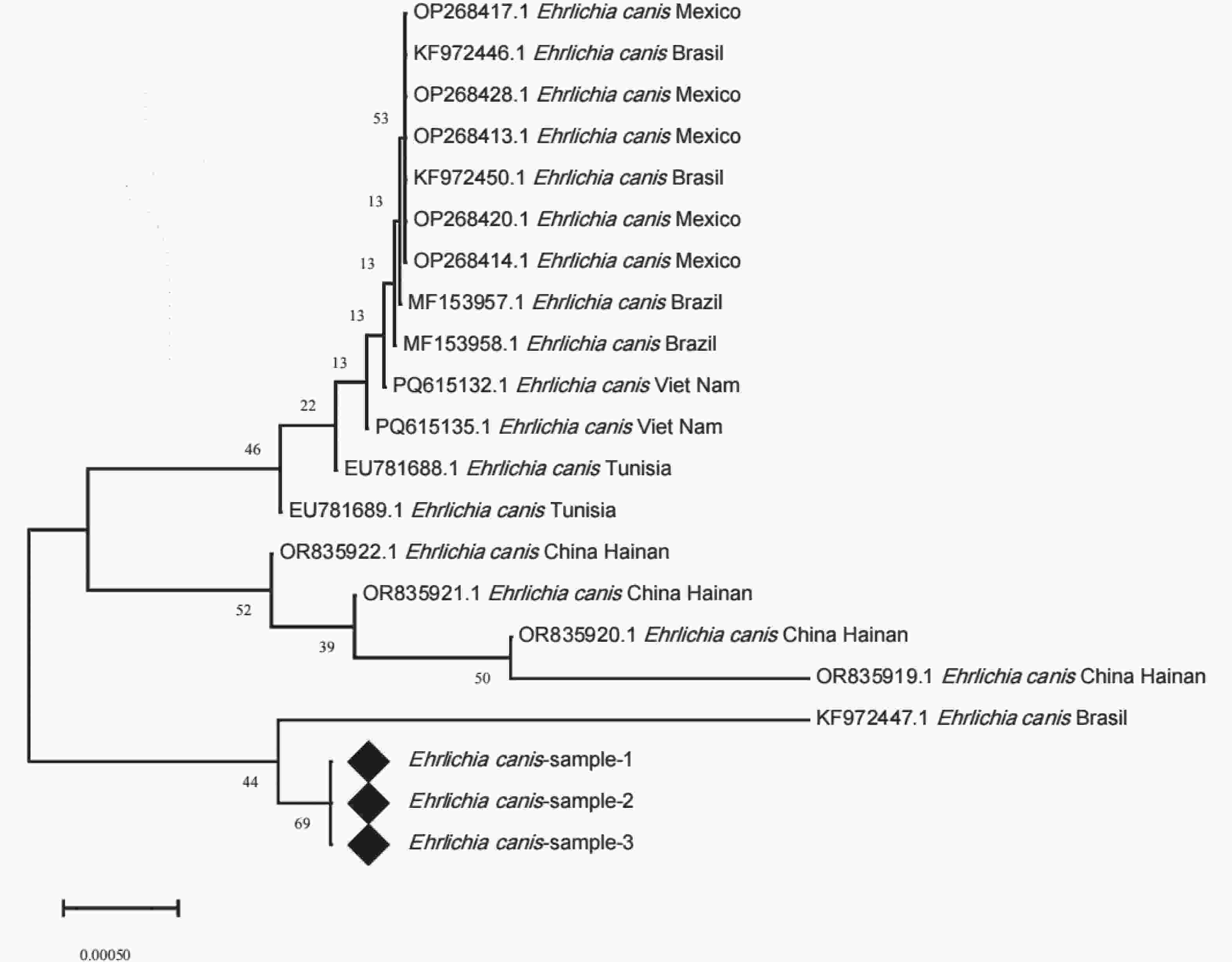 E. canis的16S rRNA基因测序数据进行分析,(通过SnapGene 8.0软件完成序列的剪切、拼接,获得目的序列,将整理后的序列提交至NCBI数据库,利用Nucleotide BLAST工具进行同源性比对),筛选出3条与E. canis同源性较高99.49%的序列,分别命名为Ehrlichia canis-sample-1、Ehrlichia canis-sample-2及Ehrlichia canis-sample-3。从GenBank数据库中下载国内外已报道的多株E. canis的16S rRNA基因参考序列,联合上述3条序列通过MEGA X软件采用MUSCLE算法进行多序列比对,基于比对结果构建系统发育树。本研究所获的3条序列聚为同一分支,并形成高度相似的单系群,表明三者在16S rRNA序列上几乎完全一致。该单系群与巴西提交的序列(KF972447.1)聚为一支,亲缘性最近,同源性99.49%;墨西哥、越南及突尼斯等地区的E. canis序列(OP268417.1、PQ615312.1、EU781688.1)分别形成若干地域性分支,与目的序列偏远较大;中国海南提交的序列(OR835919.1、OR835920.1、OR835921.1及OR835922.1)则构成独立的簇状分支,与样本亲缘性较远,同源性84.95%。上述结果表明,样本与巴西株KF972447的系统发育位置更为接近,与中国海南过去提交的序列分化较大。