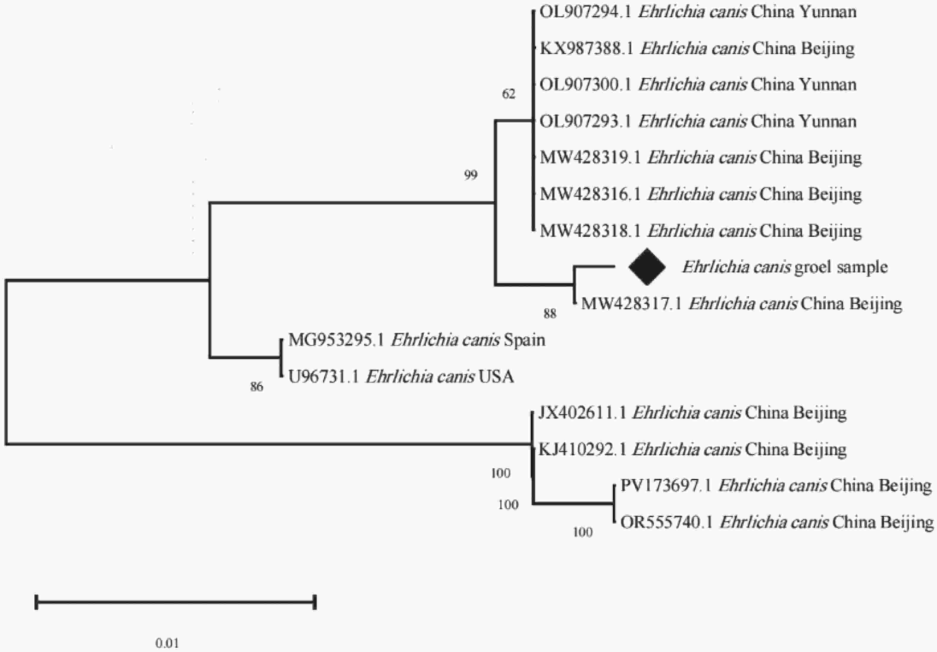 PCR阳性产物由生工生物工程公司测序,将测序得到的序列分别进行剪切、拼接和分析,用MEGA X进行同源性比对,挑选1个序列命名为Ehrlichia canis groEL sample,构建系统树。系统树结果表明,样本与中国北京提供的序列(MW428317.1)聚为一支,亲缘性最近,相似性99.72%。该近缘对与另一较大的中国的北京和云南提交的序列簇(MW428318.1、MW428316.1、MW428319.1 、OL907293.1、OL907300.1、KX987388.1、OL907294.1 等)形成旁系群,亲缘性较近,同源性为99.30%;与中国谱系的其他序列相比,另一明显独立的北京分支(JX402611.1、KJ410292.1、PV173697.1、OR555740.1),同源性95.66%,说明该独立的北京分支与样本所属分支存在明确的谱系分化。